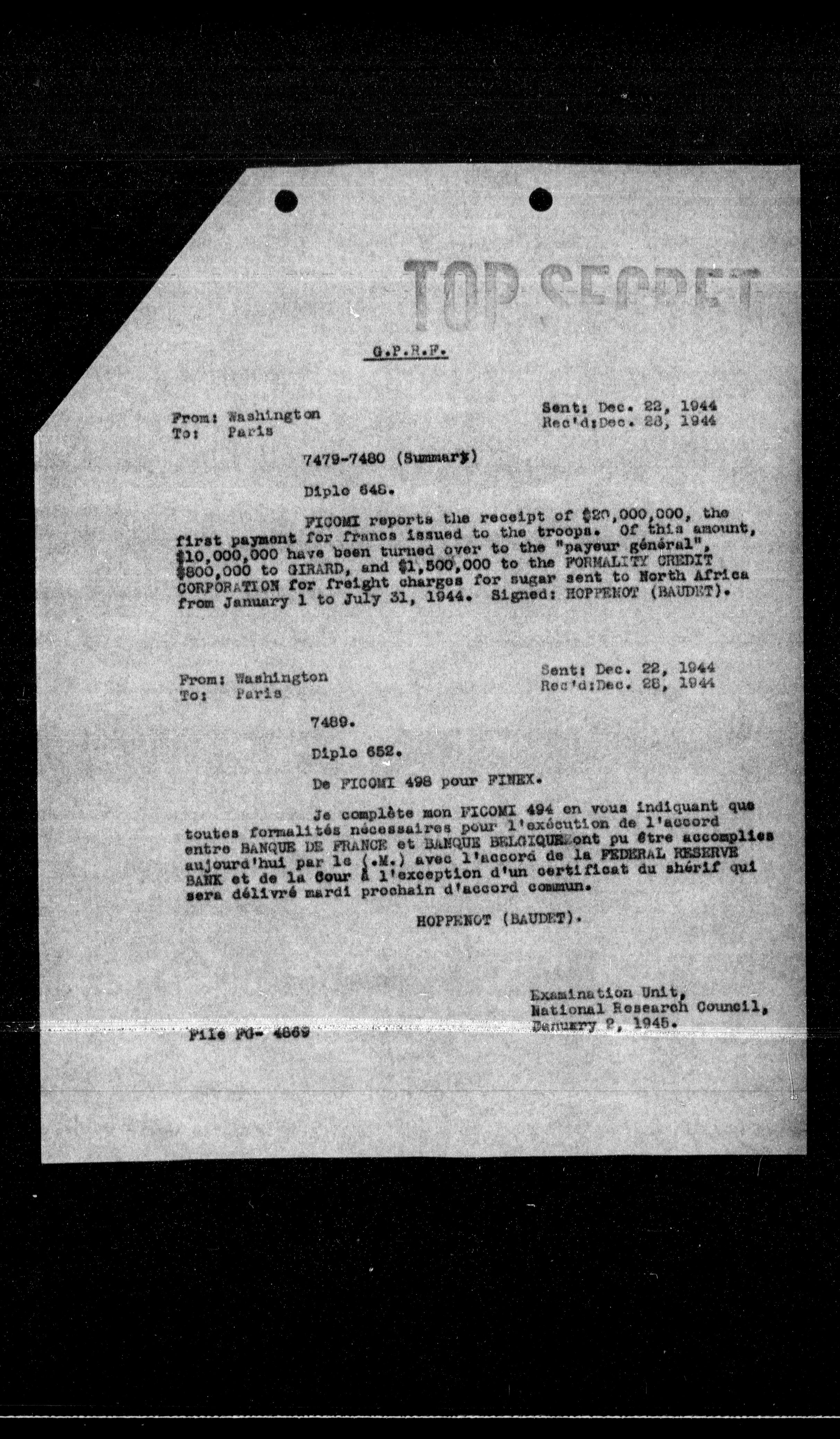 PICOMI reports the receipt of $20,000,000, the first payment for francs issued to the troops. Of this amount, $10,000,000 have been turned over to the "payeur général", $800,000 to GIBARD, and $1,500,000 to the FORMALITY CREDIT CORPORATION for freight charges for sugar sent to North Africa from January 1 to July 31, 1944. Signed: HOPPENOT (BAUDET).