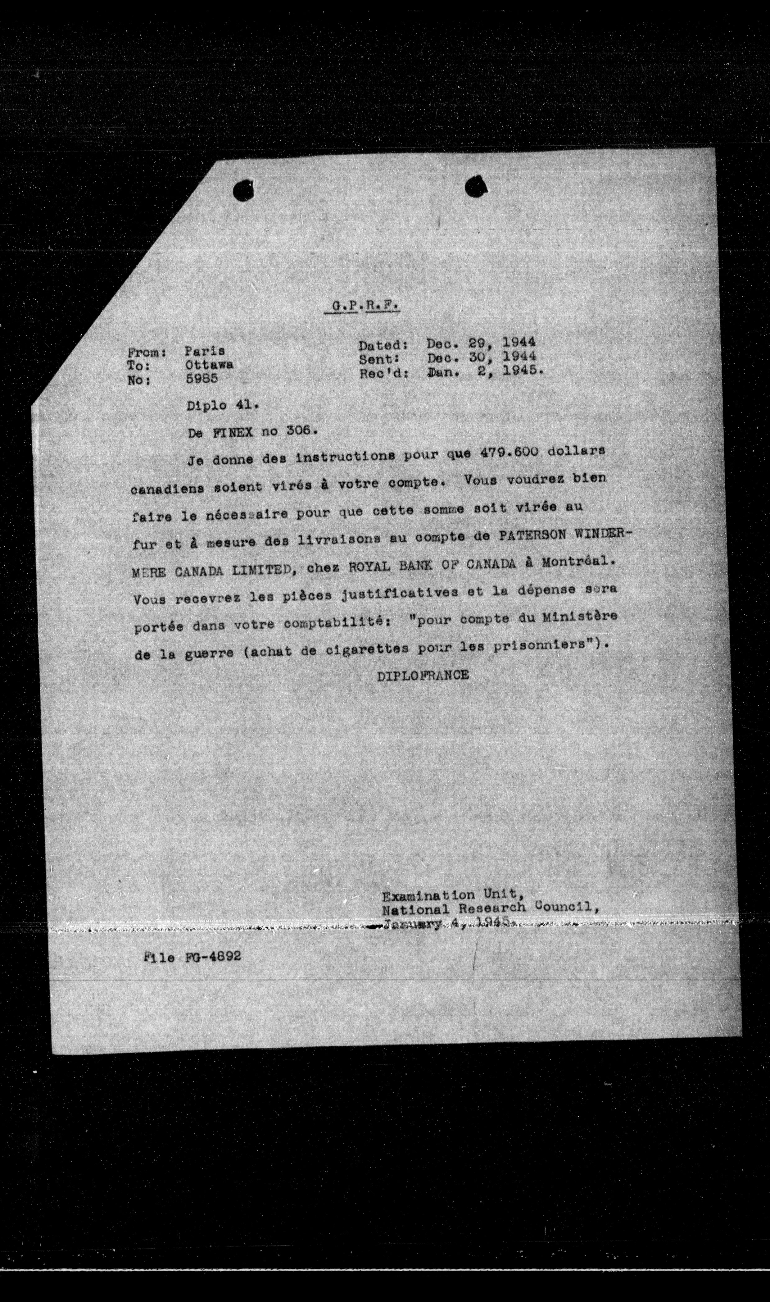Je donne des instructions pour que 479.600 dollars canadiens soient virés à votre compte. Vous voudrez bien faire le nécessaire pour que cette somme soit virée au fur et à mesure des livraisons au compte de PATERSON WINIERMERE CANADA LIMITED, chez ROYAL BANK OF CANADA à Montréal. Vous recevrez les pièces justificatives et la dépense sera portée dans votre comptabilité: "pour compte du Ministère de la guerre (achat de cigarettes pour les prisonniers").