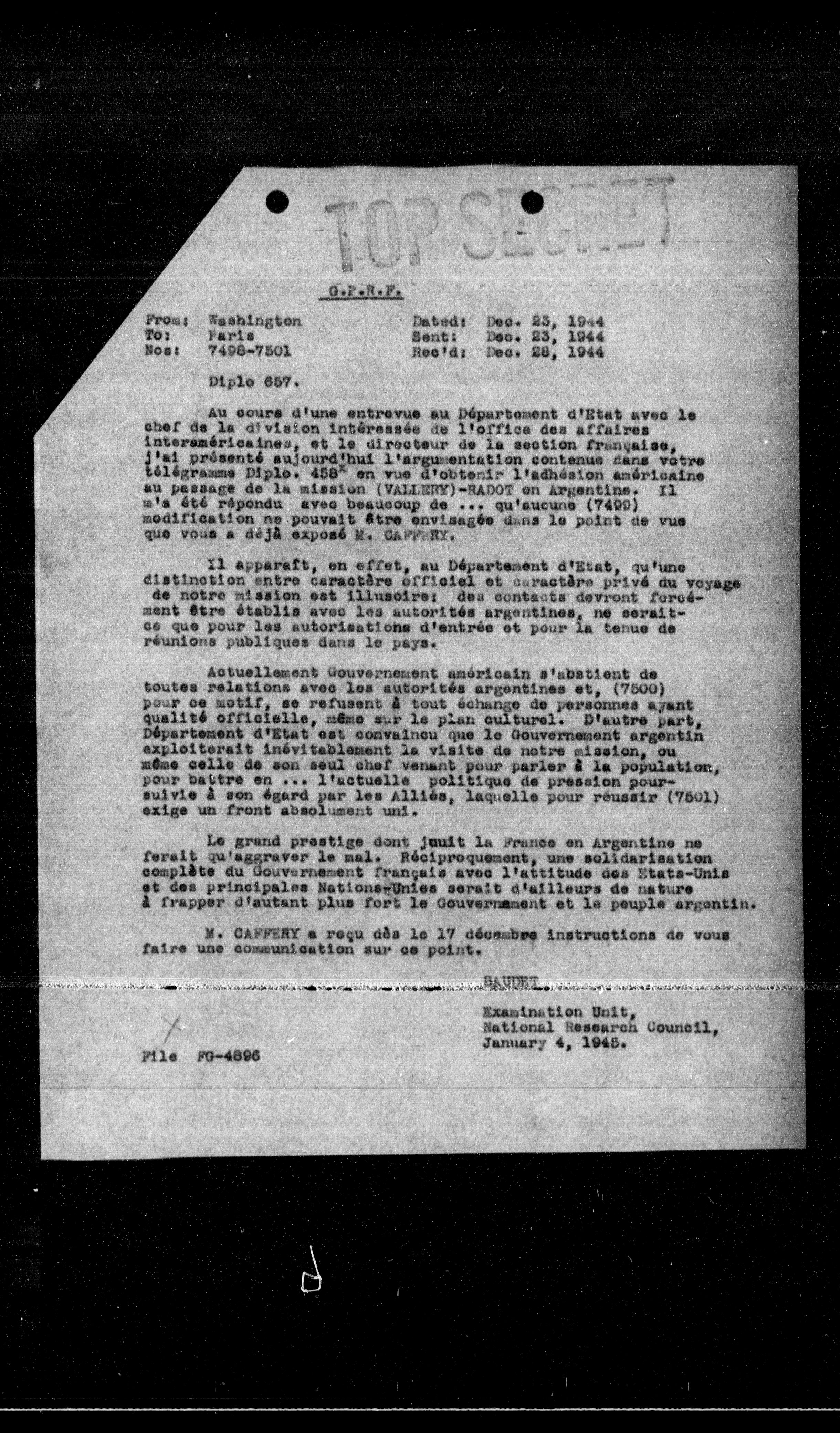 Au cours d'une entrevue au Département d'Etat avec le chef de la division intéressée de l'office des affaires interaméricaines, et le directeur de la section française, j'ai présenté aujourd'hui l'argumentation contenue dans votre téléphone Diplo 458 en vue d'obtenir l'adhésion américaine au passage de la mission (VALLENT)-RADOT en Argentine. Il m'a été répondu avec beaucoup de qu'aucune (7490) modification ne pouvait être envisagée dans le point de vue que vous a déjà exposé M. GAFFERY.
