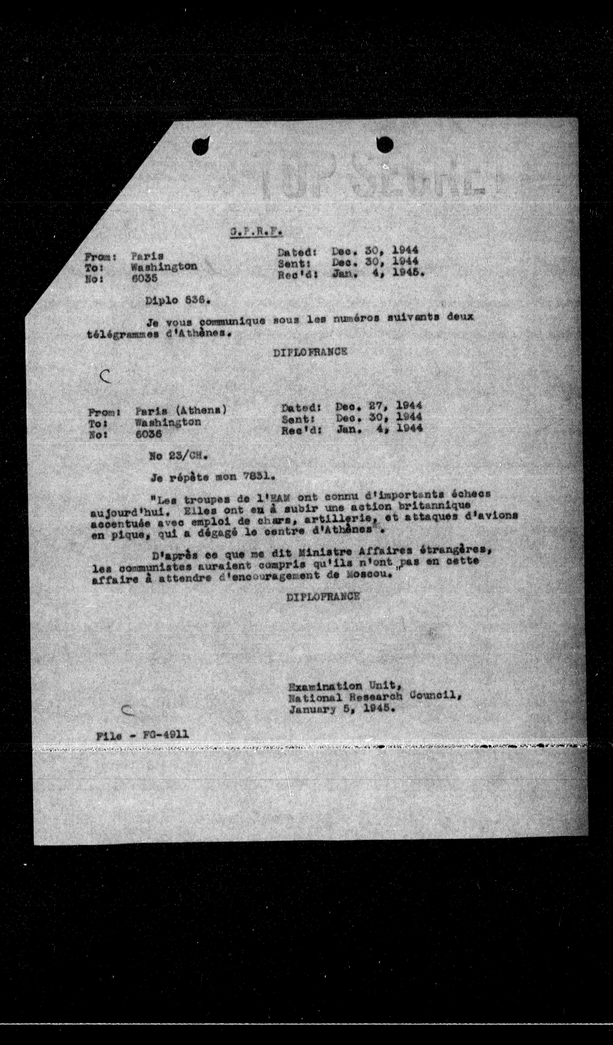 **From:** Paris (Athens) **Date:** Dec. 27, 1944 **To:** Washington **Date:** Dec. 30, 1944 **No:** 6036 **Rec'd:** Jan. 4, 1944