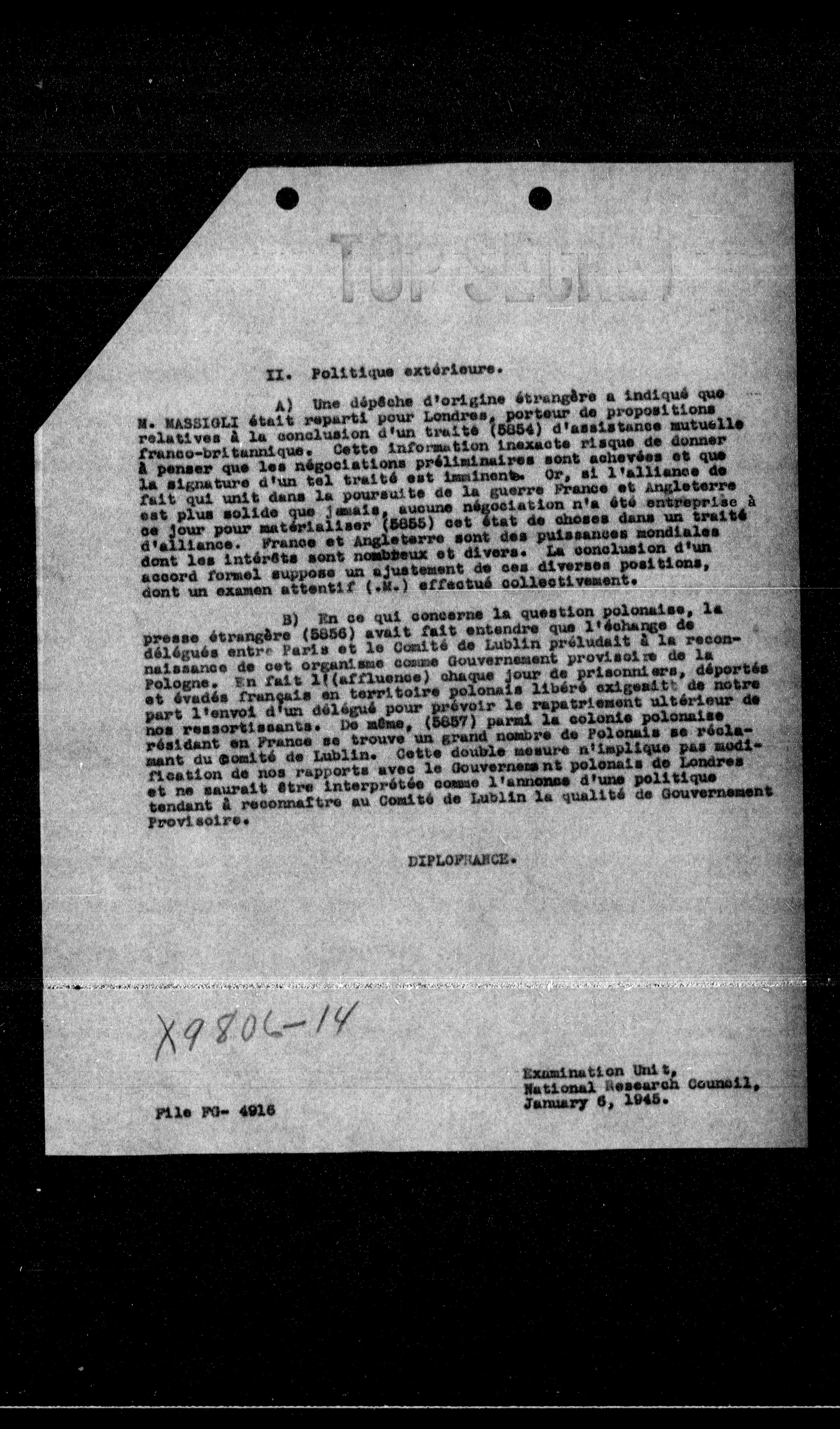 A) Une dépêche d'origine étrangère a indiqué que N. MASSIGLI était reparti pour Londres, porteur de propositions relatives à la conclusion d'un traité (5804) d'assistance mutuelle franco-britannique. Cette information incrasta risque de donner à penser que les négociations preliminares sont achevées et que la signature d'un tel traité est imminent. Or, si l'alliance de fait qui unit dans la poursuite de la guerre franco et Angleterre est plus solide que jamais, aucune négociation n'a été entreprise à ce jour pour matérialiser (5855) cet état de choses dans un traité d'alliance. France et Angleterre sont les puissances mondiales dont les intérêts sont nombreux et divers. La conclusion d'un accord formel suppose un ajustement de ces diverses positions, dont un examen attentif (.M.) effectué collectivement.