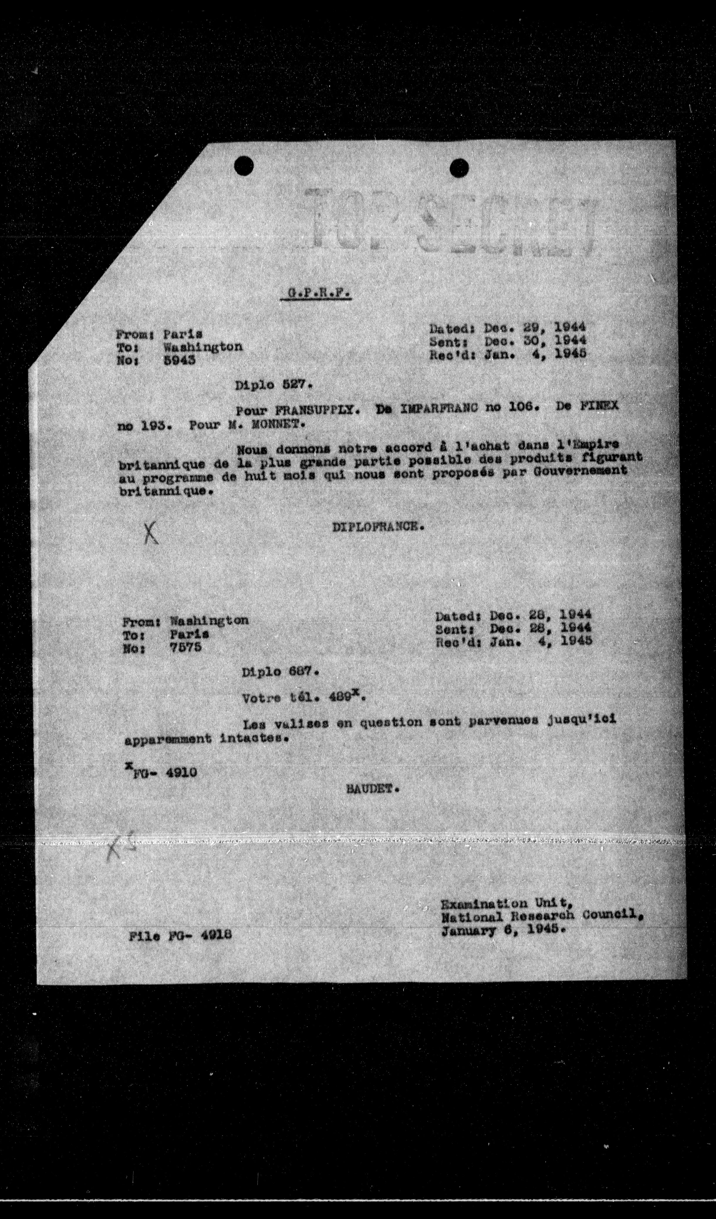 **Dated:** Dec. 28, 1944 **Sent:** Dec. 28, 1944 **Rec'd:** Jan. 4, 1945