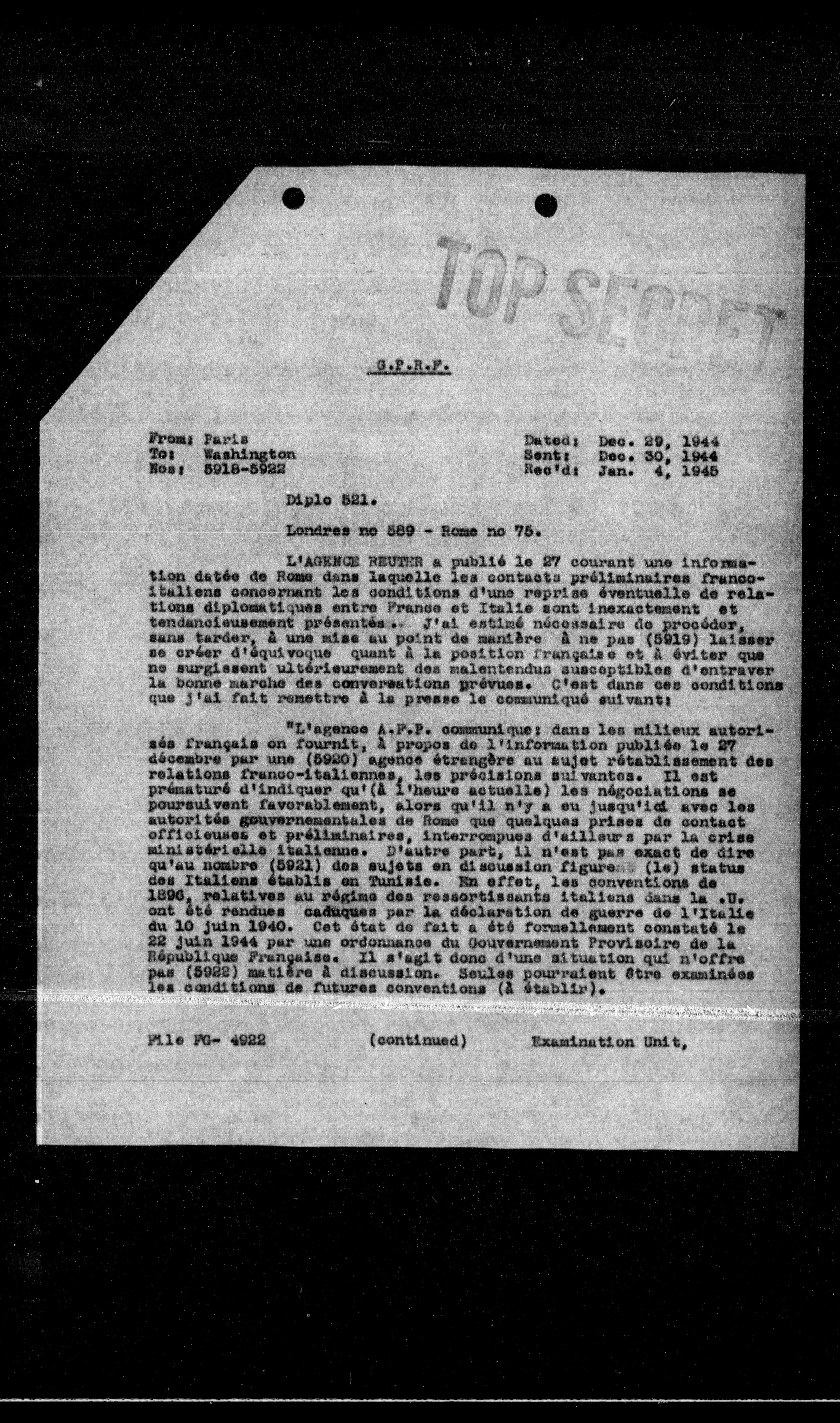 "L'agence A.F.P. communique; dans les milieux autorisés français on fournit, à propos de l'information publiée le 27 décembre par une (5920) agence étrangère au sujet rétablissement des relations francoballiennes, les précisions suivantes. Il est prématuré d'indiquer qu' (à l'heure actuelle) les négociations se poursuivent favorablement, alors qu'il n'y a eu jusqu'ici avec les autorités gouvernementales de Rome que quelques prises de contact officieuses et préliminaires, interrompues d'ailleurs par la crise ministérielle italienne. D'autre part, il n'est pas exact de dire qu'au nombre (5921) des sujets en discussion figurent (le) status des Italiens établis en Tunisie. En effet, les conventions de 1896, relatives au régime des ressortissants italiens dans la .U. ont été rendues caducées par la déclaration de guerre de l'Italie du 10 juin 1940. Cet état de fait a été formellement constaté le 22 juin 1944 par une ordonnance du Gouvernement Provisoire de la République Française. Il s'agit donc d'une situation qui n'offre pas (5922) matière à discussion. Seules pourraient être examinées les conditions de futures conventions (à établir).