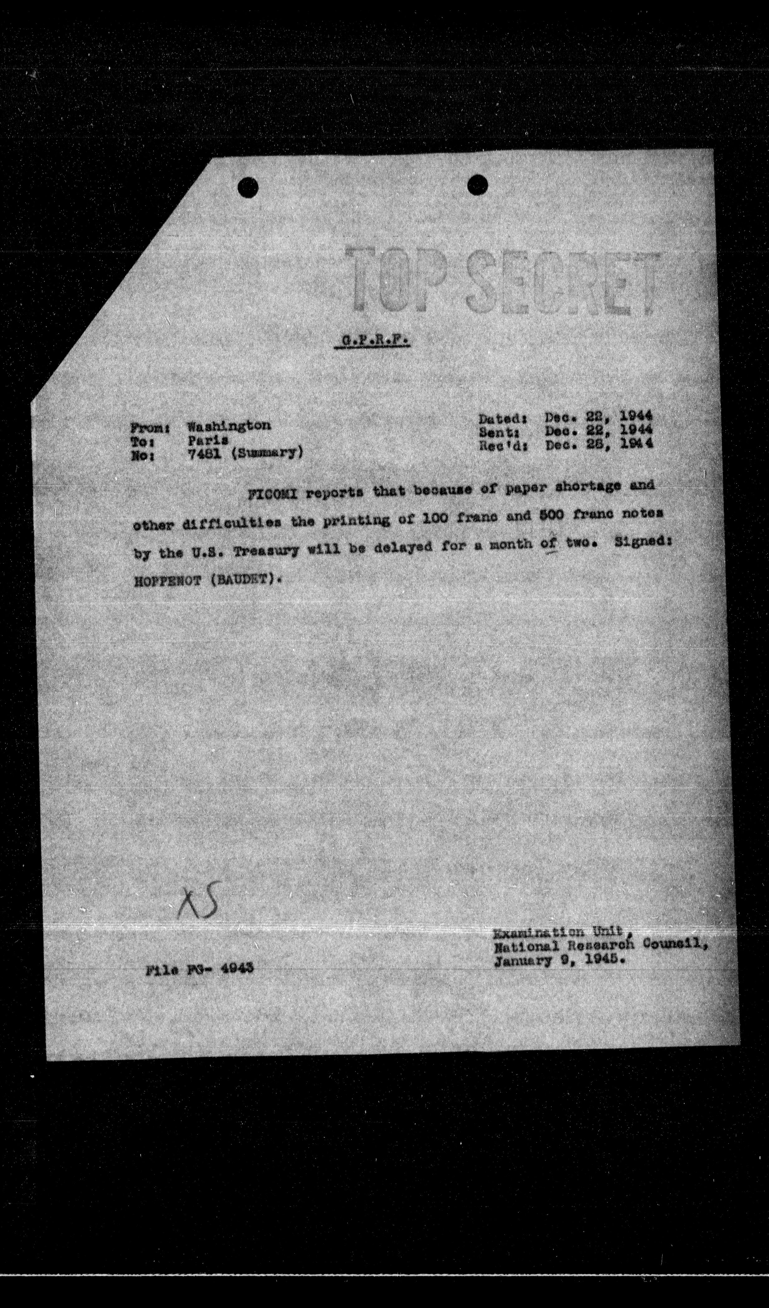 **FICORI reports that because of paper shortage and other difficulties the printing of 100 franc and 500 franc notes by the U.S. Treasury will be delayed for a month of two. Signed: HOFFENOT (BAUDET).**