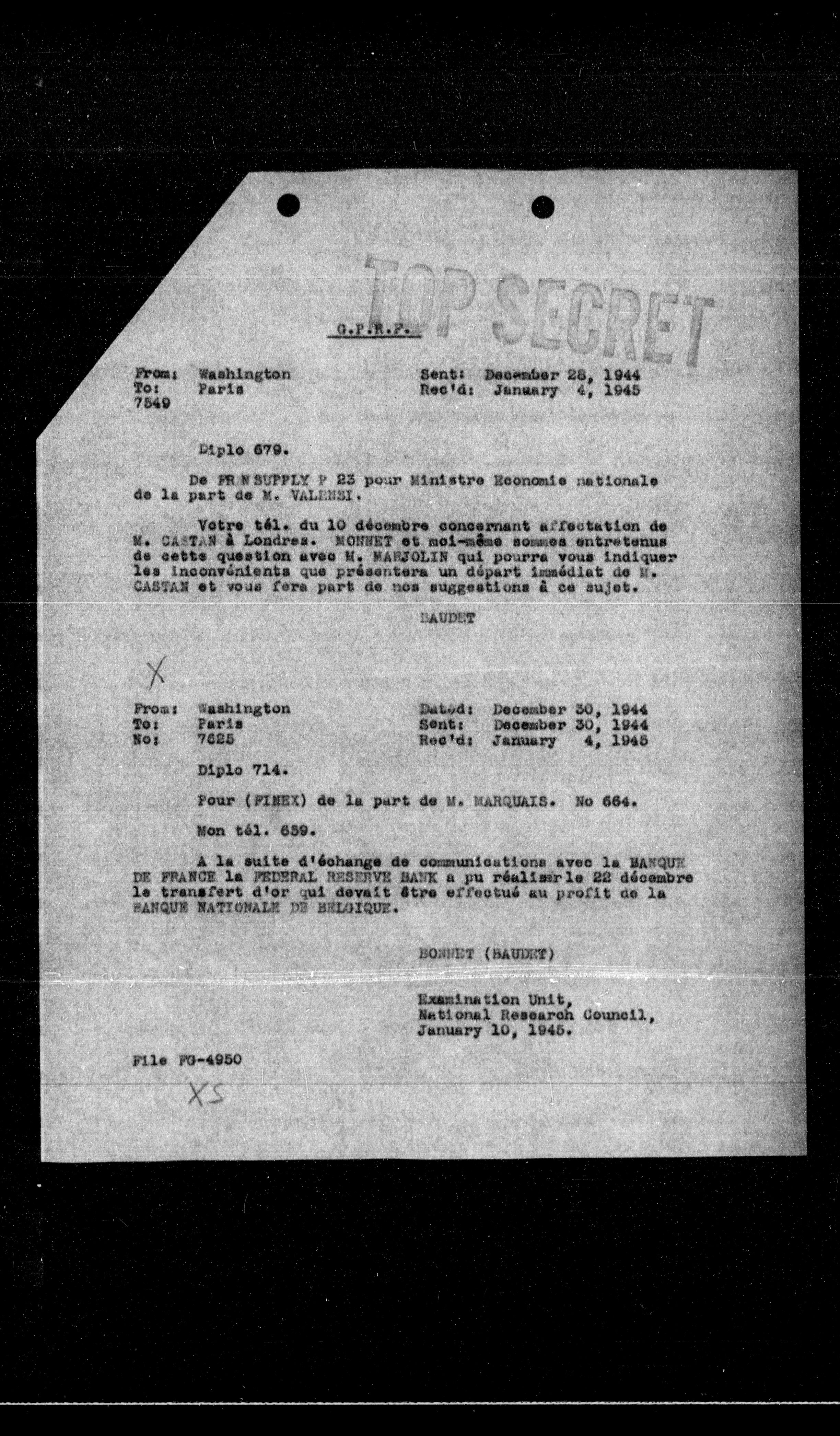 Votre t61. du 10 décembre concernant affectation de M. CASTAN a Londres. MONNET et mol-mene sommes entretenus de cette question avec M. MARJOLIN qui pourre vous indiquer les inconvénients que présentera un départ immédiat de M. CASTAN et vous fera part de nos suggestions à ce sujet.