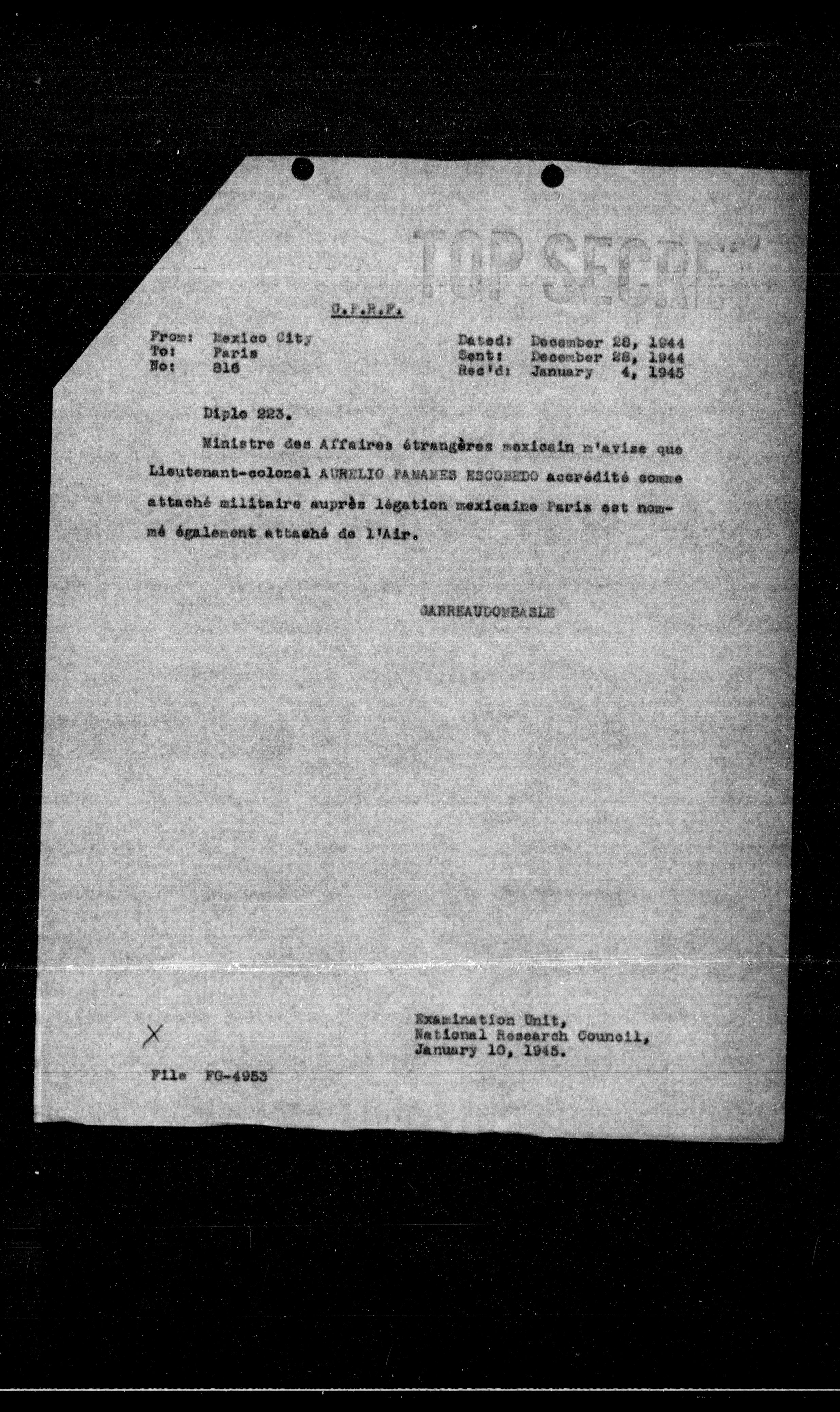 Ministre des Affaires étrangères mexicains m'avise que Lieutenant-colonel AURELIO PANANES ESCOBEDO accrédite comme attaché militaire auprès légation mexicaine Paris est nommé également attaché de l'Air.