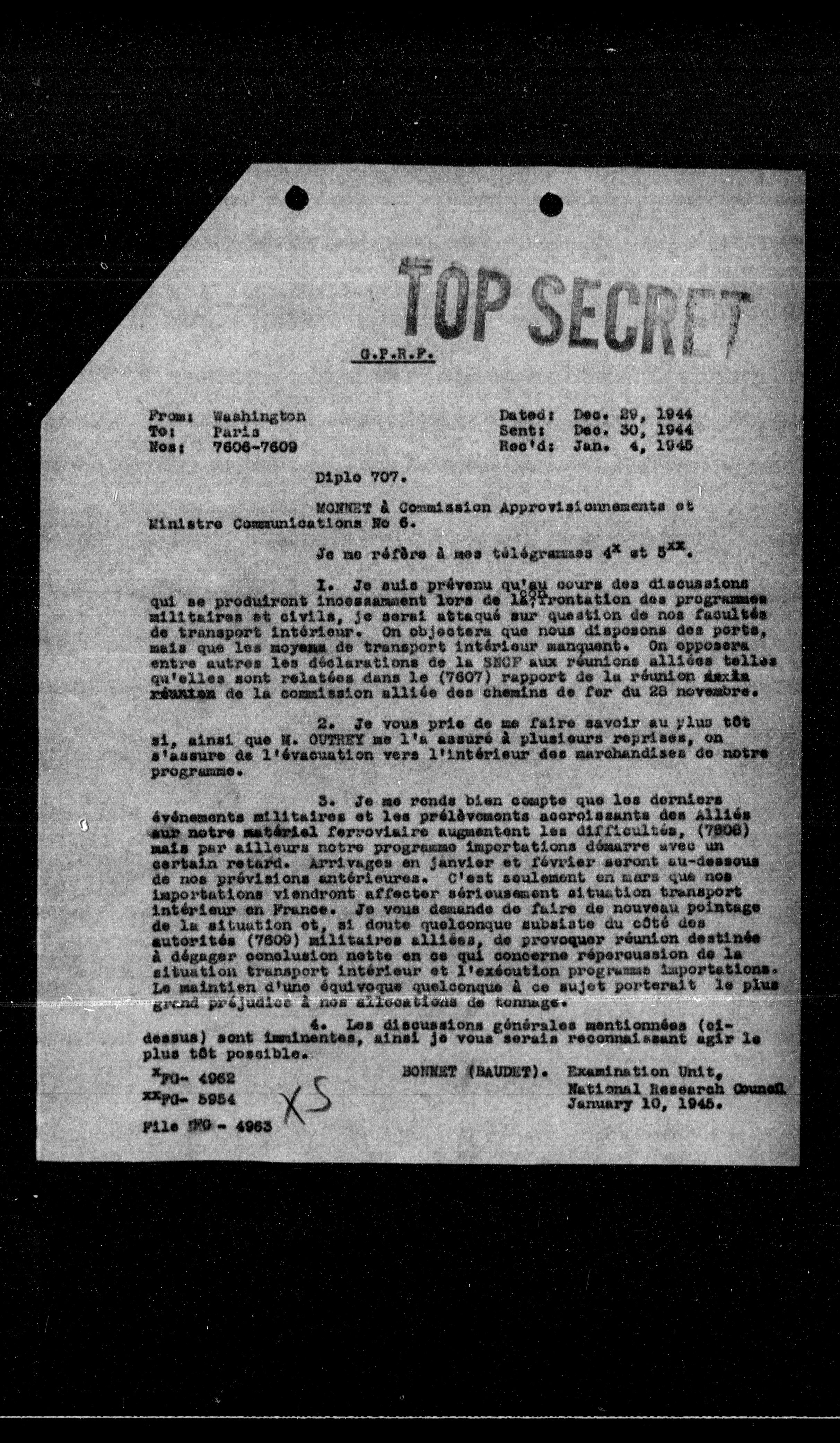 1. Je suis prévenu qu'un cours des discussions qui se produiront incessamment lors de la formation des programmes militaires et civils, je serai attaqué sur question de nos facultés de transport intérieur. On objectera que nous disposons des parts, mais que les moyens de transport intérieur manquent. On opposera entre autres les déclarations de la SNCF aux réunions alliées telles qu'elles sont relatives dans le (7607) rapport de la réunion de la réunion de la commission alliée des chemins de fer du 28 novembre.