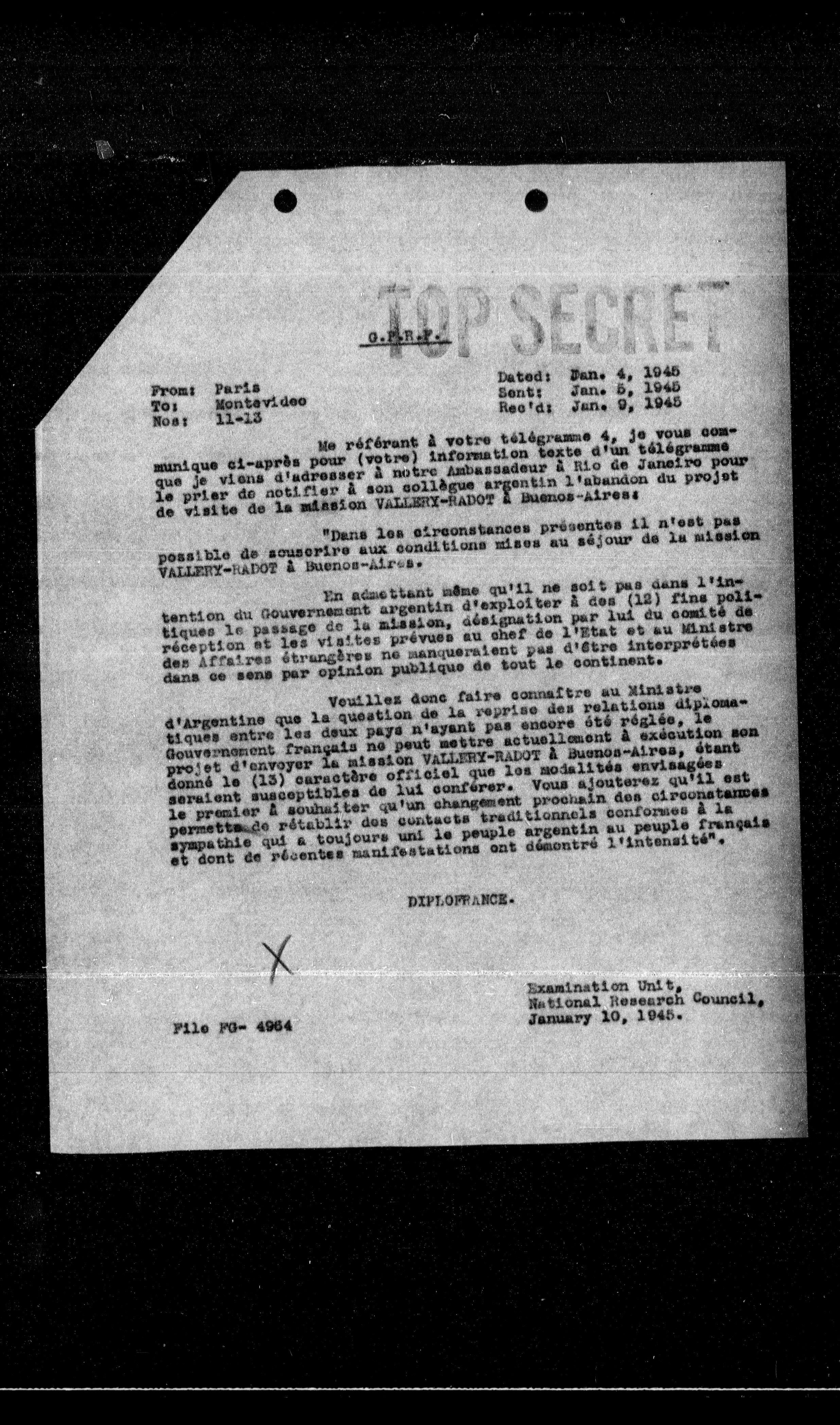 Veuillez donc faire connaître au Ministre d'Argentine que la question de la reprise des relations diplomatiques entre les deux pays n'ayant pas encore été réglée, le Gouvernement français ne peut mettre actuellement à exécution son projet d'envoyer la mission VALLERY-RADOT à Buenos-Aires, étant donné le (13) caractère officiel que les modalités envisagées seraient susceptibles de lui conférer. Vous ajouterez qu'il est le premier à souhaiter qu'un changement prochain des circonstances permettra de rétablir des contacts traditionnels conformes à la sympathie qui a toujours uni le peuple argentin au peuple français et dont de récentes manifestations ont démontré l'intensité".