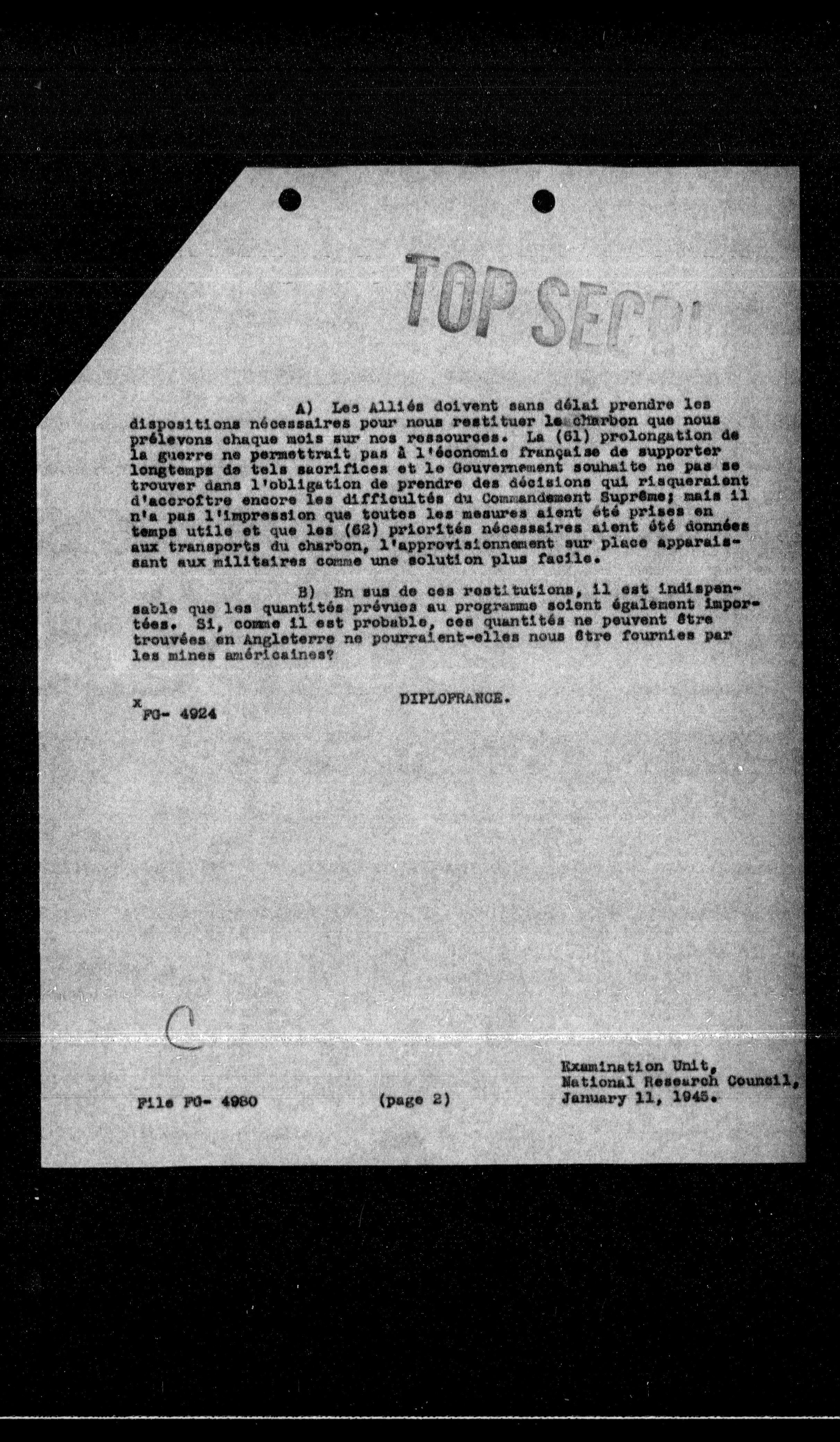 - A) Les allies doivent sans délai prendre les dispositions nécessaires pour nous restituer le charbon que nous prelevons chaque mois sur nos ressources. La (61) prolongation de la guerre ne permettrait pas a l'économie frangaine de supporter longtemps de tels sacrifices et le Gouvernement souhaite ne pas se trouver dans l'obligation de prendre des décisions qui risqueraient d'acoroftre encore les diffisultes du Conmandement Suprême; mais il nia pas l'impression que toutes les mesures aient été prises en temps utile et que les (62) priorités nécessaires aient été données aux transports du charbon, l'approvisionnement sur place apparaissant aux militaires comme une solution plus facile.