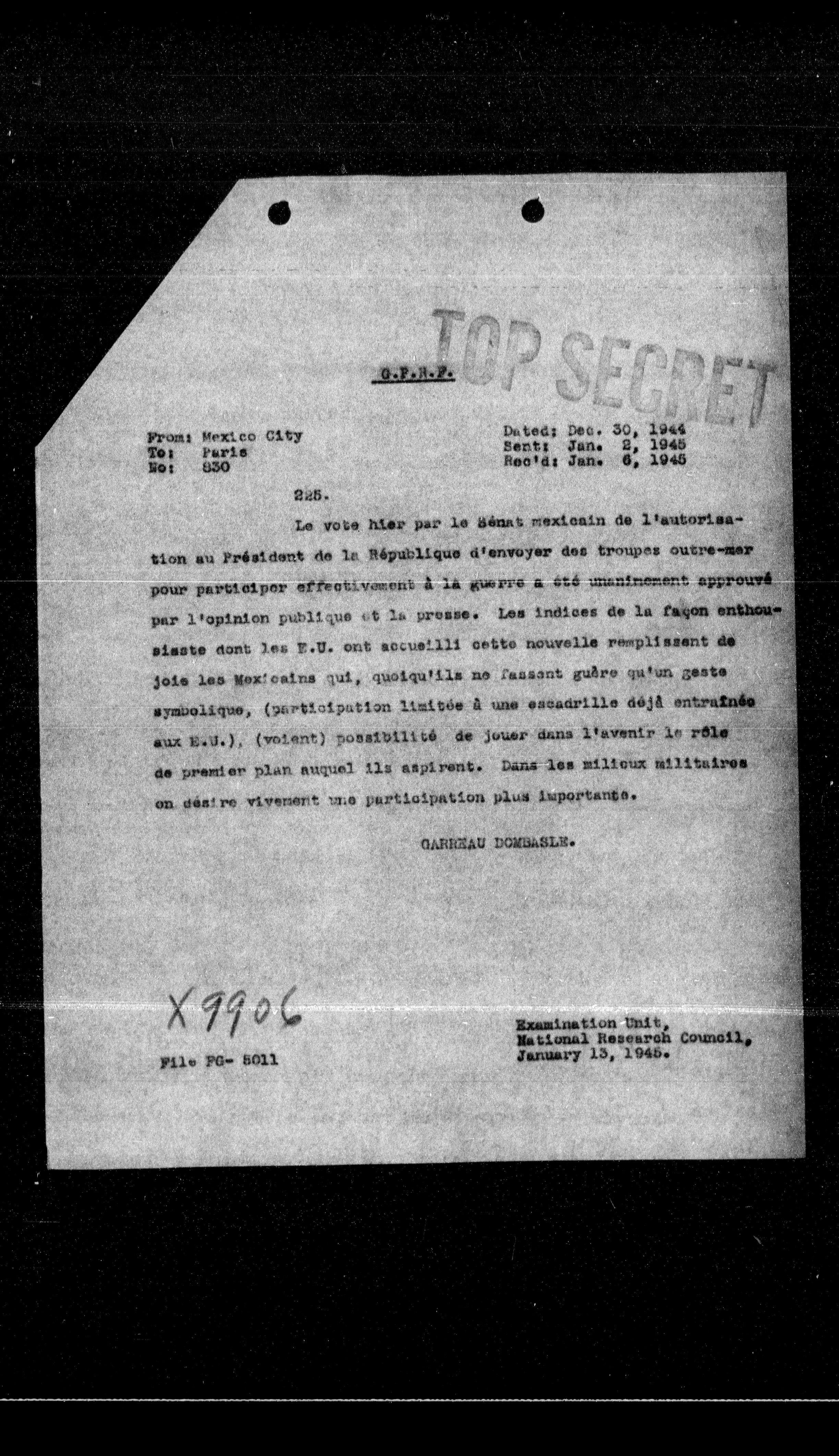 Le vote hier par le Sénat mexicain de l'autorisation au Président de la République d'envoyer des troupes outre-mer pour participer effectivement à la guerre a été unanimement approuvé par l'opinion publique et la presse. Les indices de la façon enthousiaste dont les E.U. ont accueilli cette nouvelle remplissent de joie les Mexicains qui, quoiqu'ils ne fassent guère qu'un geste symbolique, (participation limitée à une escadrille déjà entraînée aux E.U.), (volent) possibilité de jouer dans l'avenir le rôle de premier plan auquel ils aspirent. Dans les milieux militaires on désire vivement une participation plus importante.