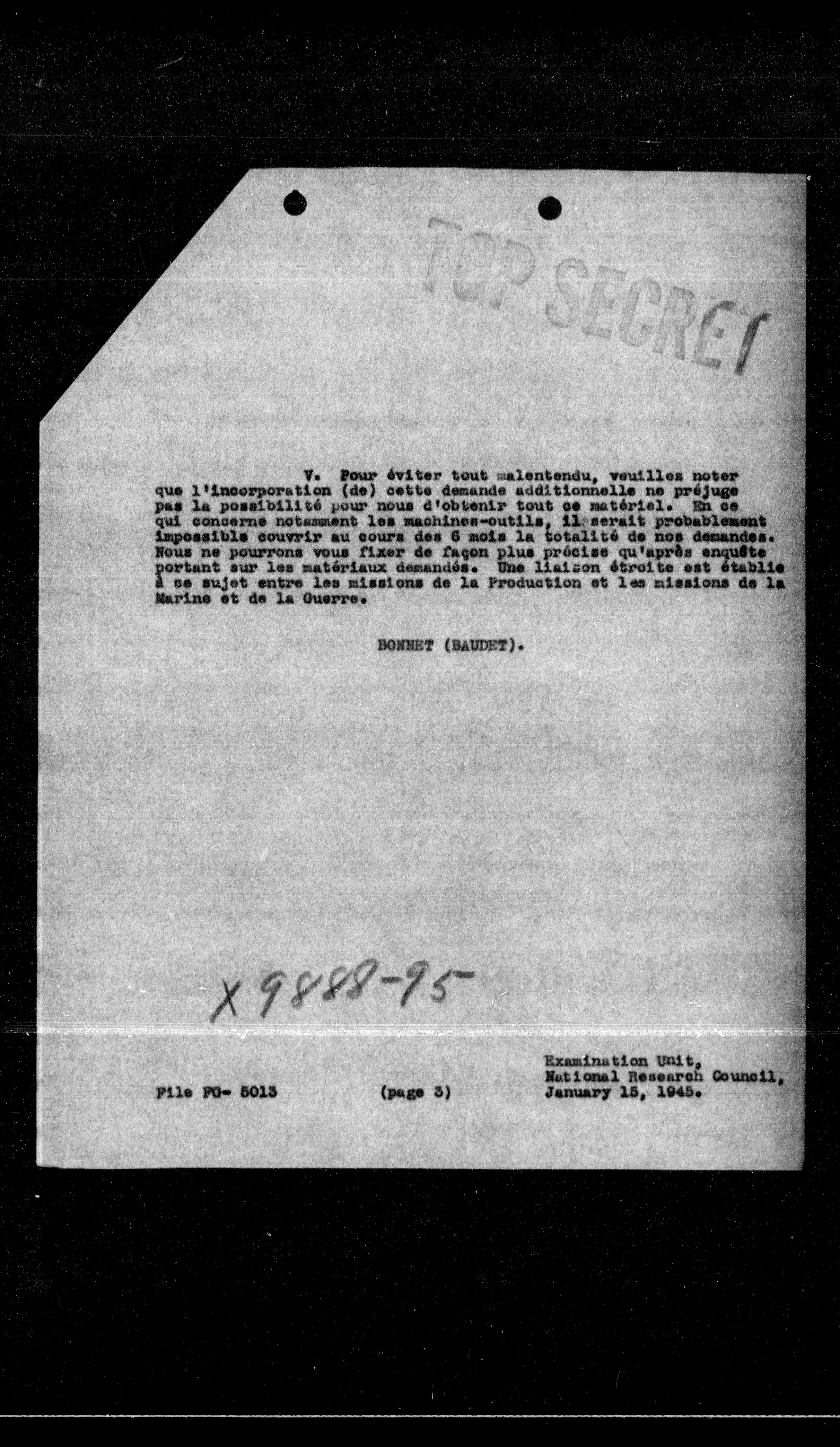 V. Pour éviter tout malentendu, veuillez noter que l'incorporation (de) cette demande additionnelle ne préjuge pas la possibilité pour nous d'obtenir tout ce matériel. En ce qui concerne notamment les machines-outils, il serait probablement impossible couvrir au cours des 6 mois la totalité de nos demandes. Nous ne pourrons vous fixer de façon plus précise qu'après enquête portant sur les matériaux demandés. Une liaison étroite est établie à ce sujet entre les missions de la Production et les missions de la Marine et de la Guerre.