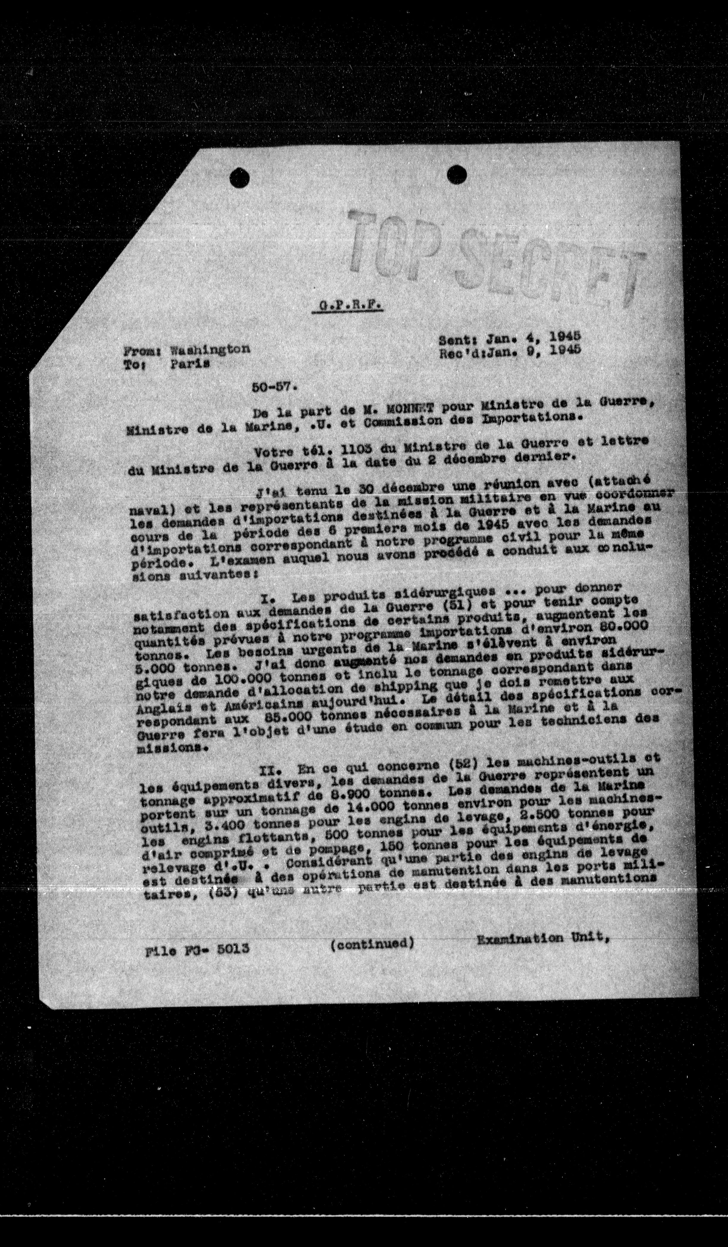 I. Les produits sidérurgiques pour donner satisfaction aux demandes de la Guerre (M1) et pour tenir compte notamment des spécifications de certains produits, augmentent les quantités prévues à notre programme importations d'environ 80.000 tonnes. Les besoins urgents de la Marine s'élèvent à environ 5.000 tonnes. J'ai donc augmenté nos demandes en produits sidérurgiques de 100.000 tonnes et inclu le tonnage correspondant dans notre demande d'allocation de shipping que je dois remettre aux Anglais et Américains aujourd'hui. Le détail des spécifications correspondant aux 85.000 tonnes nécessaires à la Marine et à la Guerre fera l'objet d'une étude en commun pour les techniciens des missions.