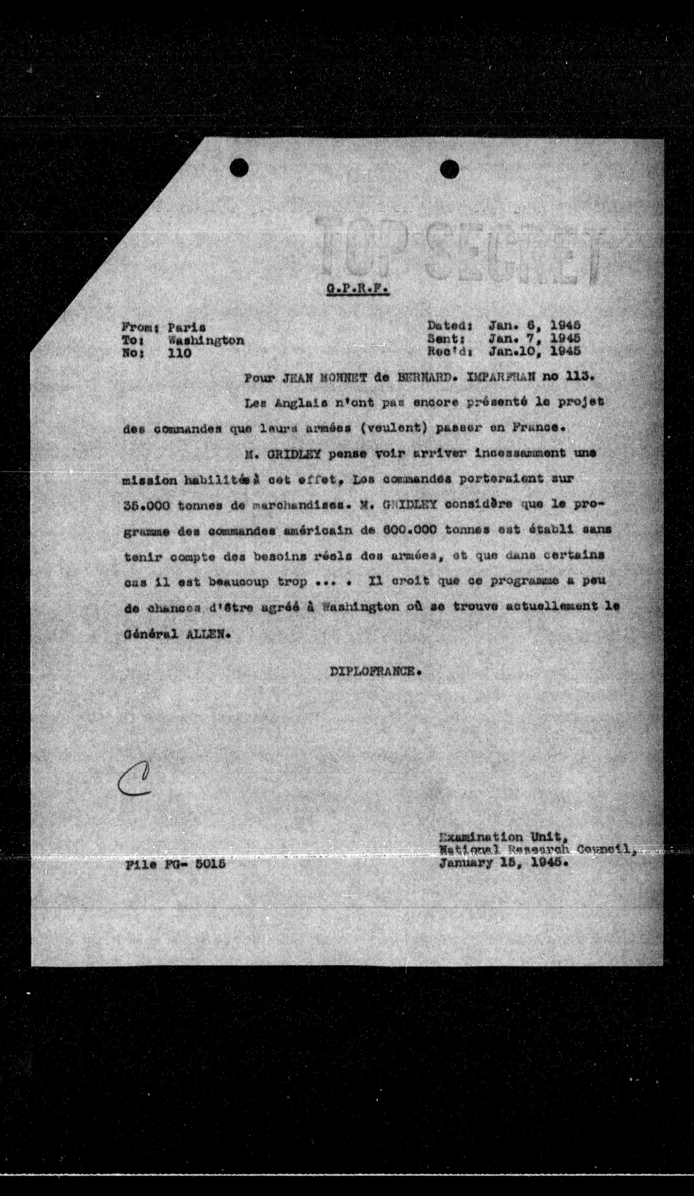 **From:** Paris **To:** Washington **No:** 110