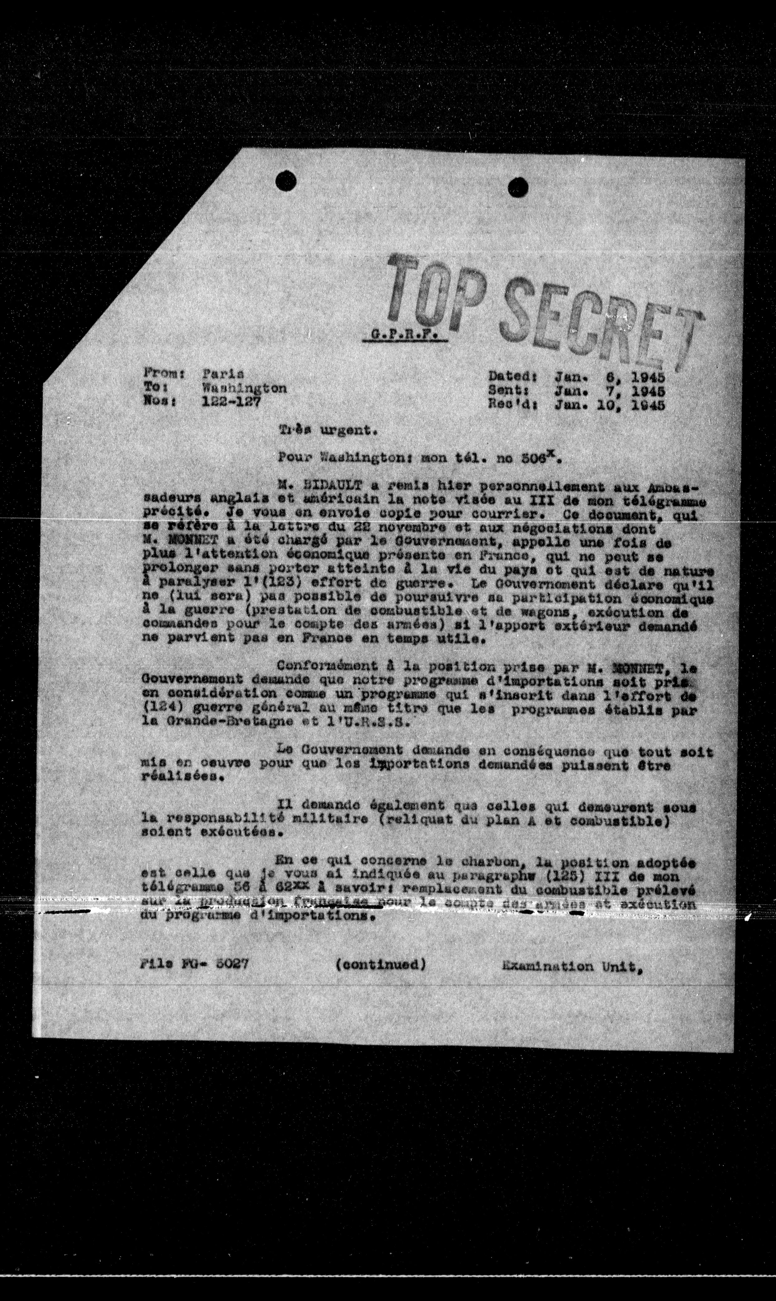 M. BIDAULT a remis hier personnellement aux maissadeurs anglais et américain la note visée au III de mon téléphone préalable. Je vous en envoie copie pour courrier. Ce document, qui se réfère à la lettre du 22 novembre et aux expectations dont M. BIDAULT a été chargé par le Gouvernement, appelle une fois de plus l'attention économique présente en France, qui ne peut se prolonger sans porter atteinte à la vie du pays et qui est de nature à paralyser l'(123) effort de guerre. Le Gouvernement déclare qu'il ne (lui sera) pas possible de poursuivre sa participation économique à la guerre (prestation de combustible et de wagons, adoption de commandes pour le compte des armées) si l'apport extérieur demandé ne parvient pas en France en temps utile.