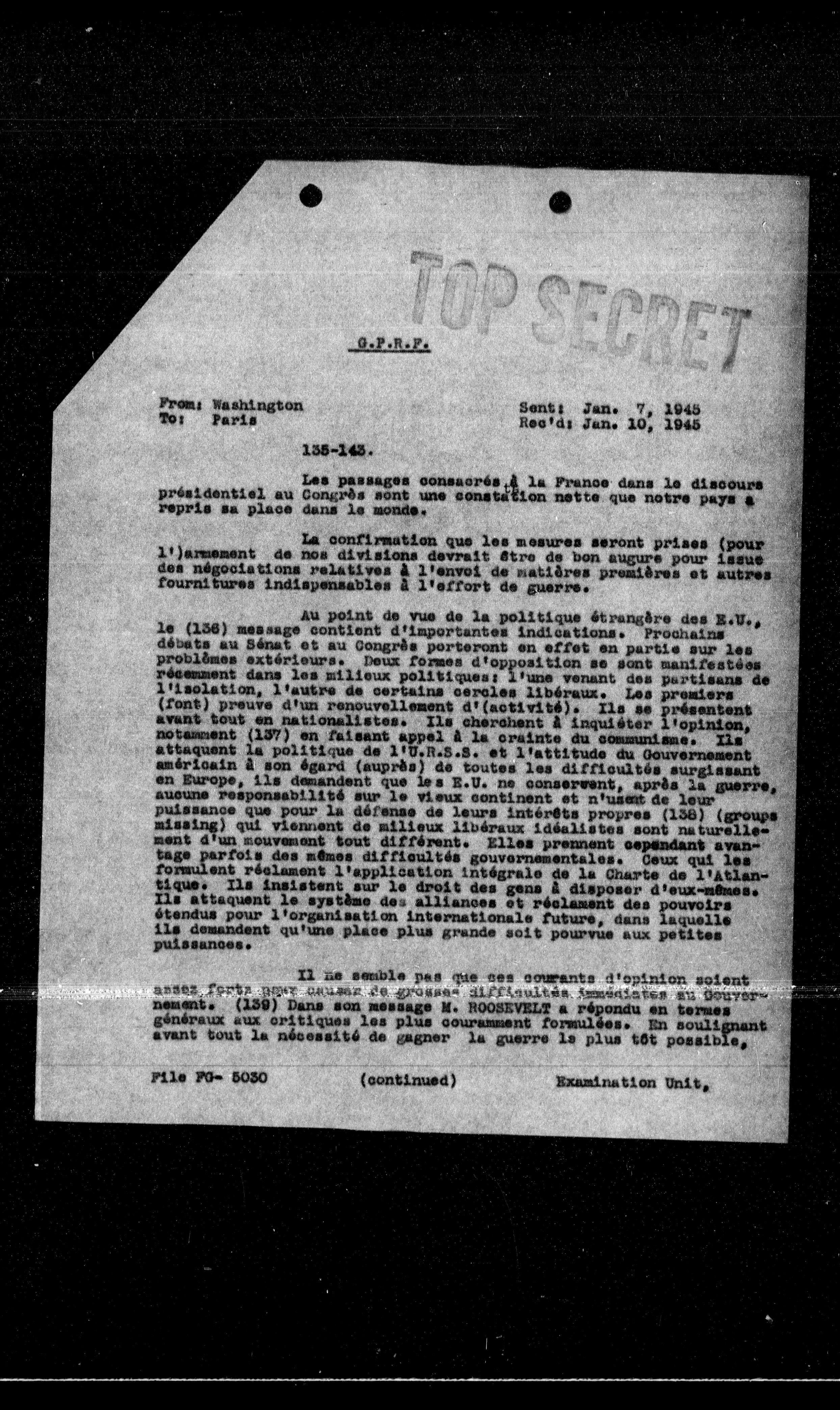 Au point de vus de la politique étrangère des E.U., le (136) message contient d'importantes indications. Prochains débats au Sount et au Congrès porteront en effet en partie sur les problèmes extérieurs. Deux formes d'opposition se sont manifestées récemment dans les milieux politiques: l'une venant des partisans de l'izolation, l'autre de certains cercles libéraux. Les premiers (font) preuve d'un renouvellement d'(activite). Il se présentent avant tout en nationalistes. Ils cherchent a inquiéter l'opinion, notamment (137) en faisant appel à la crainte du communisme. Ils attaquent la politique de l'O.R.S.S. et l'attitude du Gouvernement américain à son égard (auprès) de toutes les difficultés surgiement en Europe, ils demandent que les E.U. ne conservent, après la guerre, aucune responsabilité sur le vieux continent et n'usan de leur puissance que pour la défense de leurs intérêts propres (138) (groupe missing) qui viennent de milieux libéraux idéallstes sont naturellement a un mouvement tout différent. Elles prennent cependant avantage parfois des armes difficultés gouvernementales. Ceux qui le formulent réclament l'application intégrale de la Charte de l'Atlantique. Ils insistent sur le droit des gens à disposer d'eux-mêmes. Il attaquent la pratique des alliances et réclament des pouvoirs étendus pour l'organisation internationale future, dans laquelle ils demandent qu'une place plus grande soit pourvue aux petites puissantes.