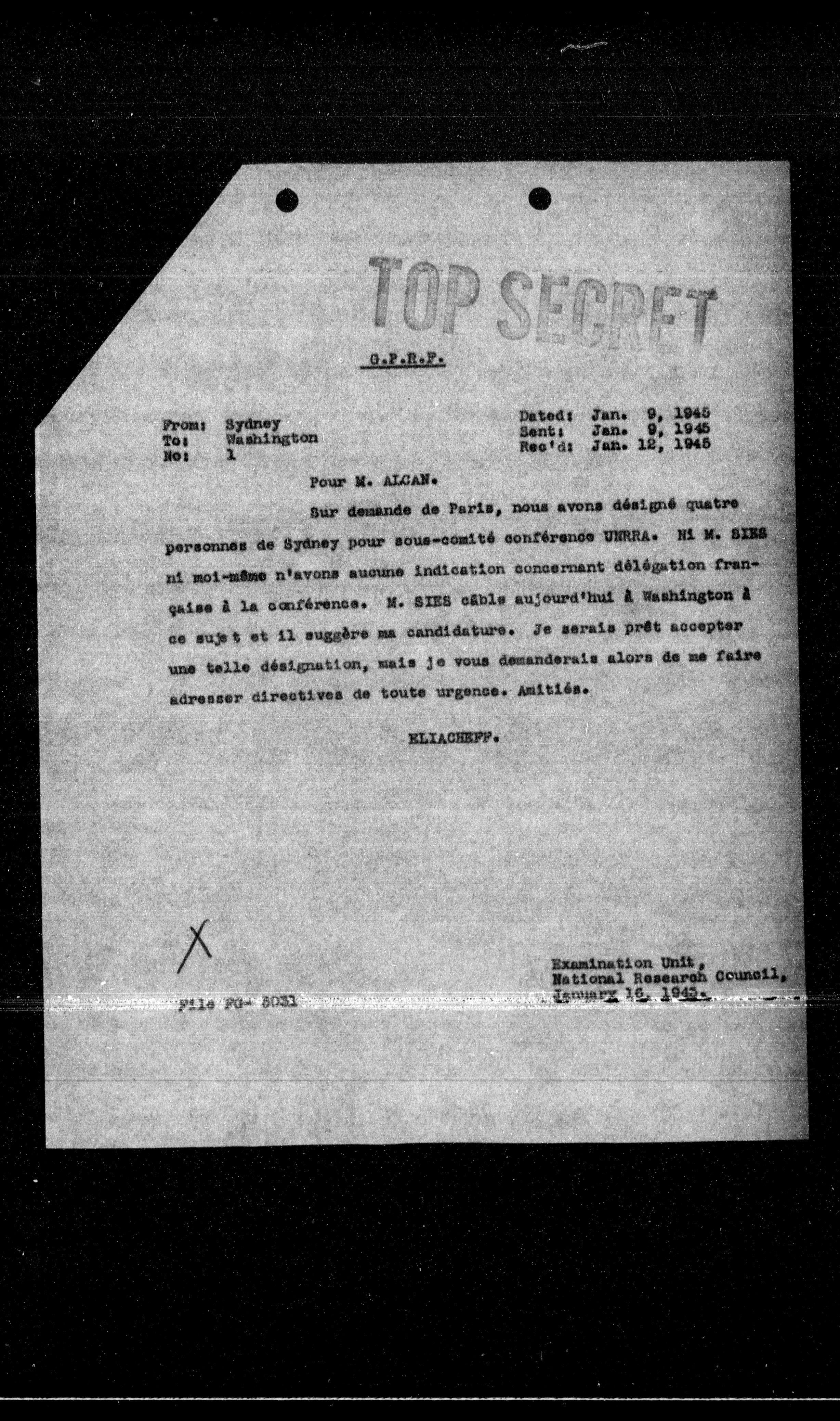 Sur demande de Paris, nous avons désigné quatre personnes de Sydney pour sous-comité conférence UNRRA. M. M. SIES ni moi-même n'avons aucune indication concernant délégation française à la conférence. M. SIES câble aujourd'hui à Washington à ce sujet et il suggère ma candidature. Je serais prêt accepter une telle désignation, mais je vous demanderais alors de me faire adresser directives de toute urgence. Amitiés.