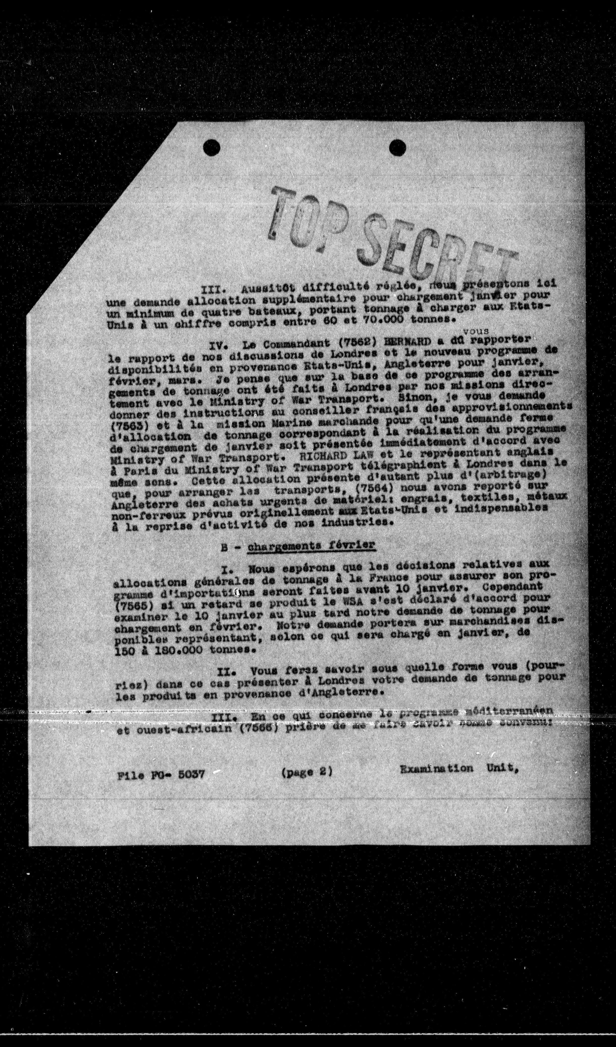 IV. Le Commandant (7562) HERMAND a dû rapporter le rapport de nos discussions de Londres et le nouveau programme de disponibilités en provenance de l'État de l'Ancienを発表. Les deux premiers, 7562, ont été pris à Londres par nos missions directement avec le Ministry of War Transport. Sinon, je vous demande de la conclusion au conseiller français des approvisionnements (7563) et à la mission Marine marchande pour qu'une demande ferme d'allocation de tonnage correspondante à la réalisation du programme de chargement de janvier soit présentée immédiatement à l'assemblée du Ministère of War Transport. RICHARD LAM et le représentant anglais à Paris du Ministry of War Transport télégradièrent à Londres dans le même sens. Cette allocation présente d'autant plus d'« arbitrage » que, pour arranger les transports, 7564 nous avons reporté sur les achats urgents de matériel: engrais, textiles, métaux non-ferreux prévus originellement aux États-Unis et indispensables à la reprise d'activité de nos industries.