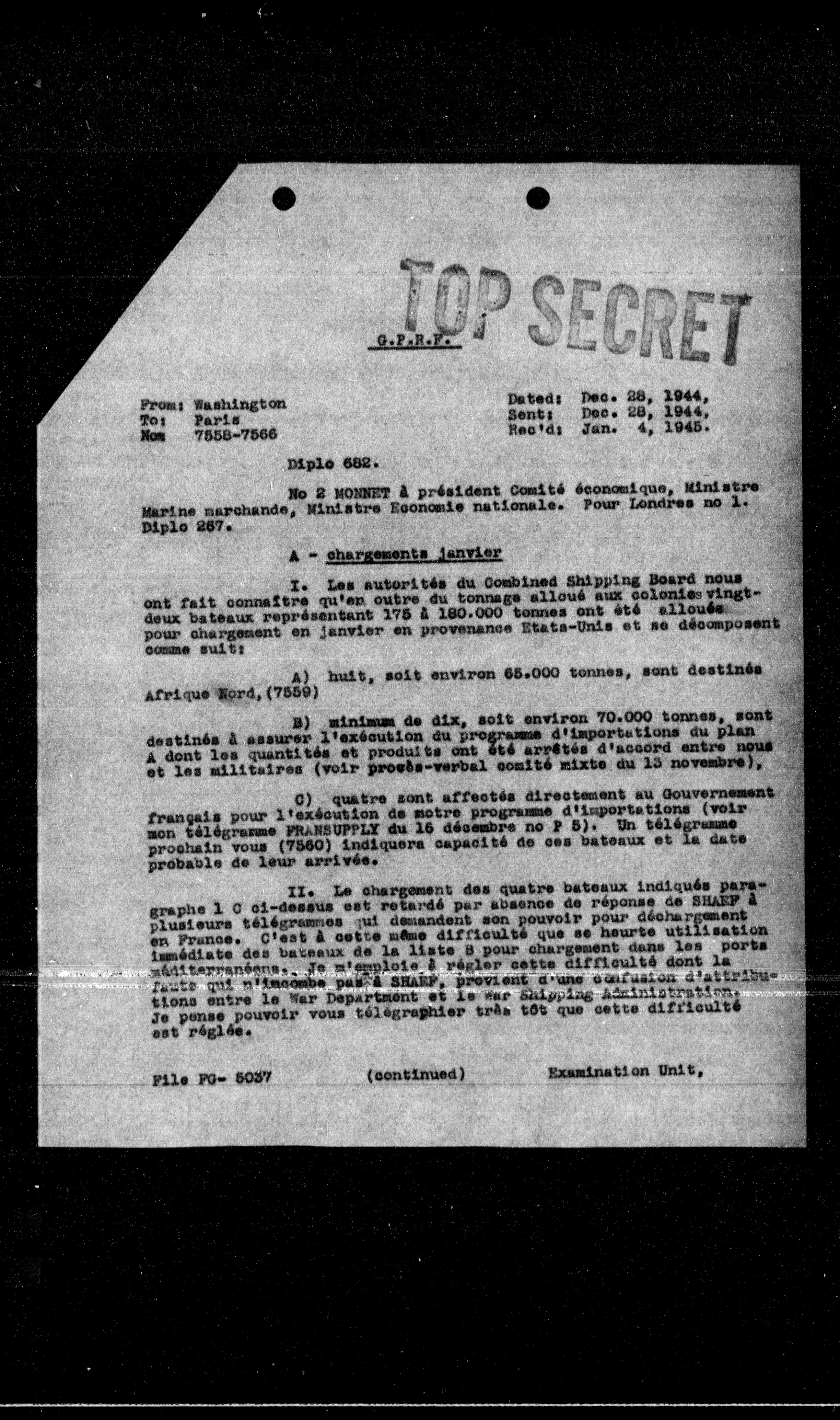 II. Le chargement des quatre bateaux indiqués paragraphe 1 c ci-dessus est retardé par absence de réponse de SNARF à plusieurs télégrammes qui demandent son pouvoir pour déchargement en France. C'est à cette même difficulté que se heurte utilisation immédiate des bateaux de la liste B pour chargement dans les ports méditerranéens. Je m'emploie à régler cette difficulté dont la faute qui m'imcombe pas à SNARF, provient d'une confusion d'attributions entre le bar Department et le bar Shipping Administration. Je pense pouvoir vous télégrapner très tôt que cette difficulté est réglée.