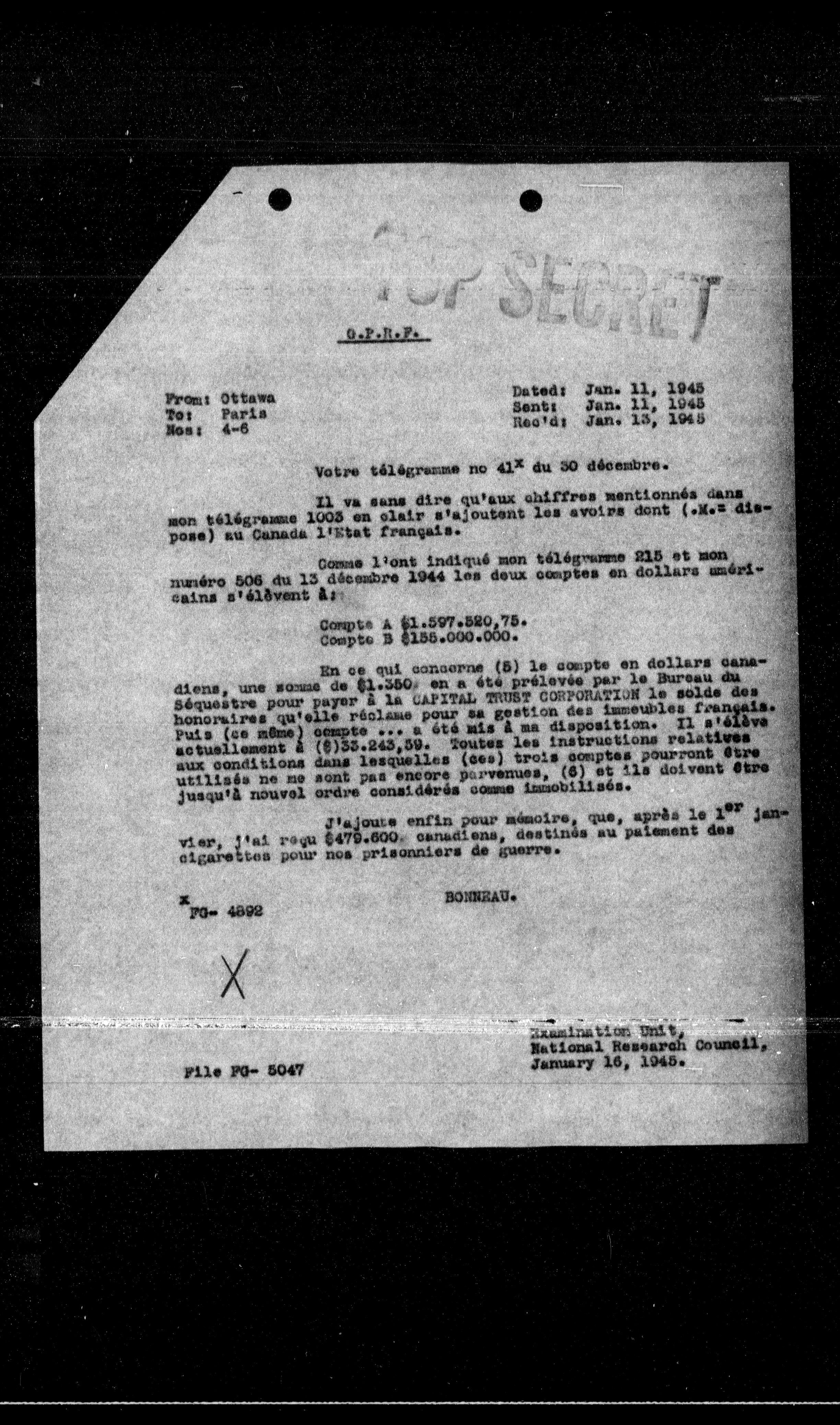 En ce qui concerne (5) le compte en dollars canadiens, une somme de $1.350 en a été prélevée par le Bureau du Séquastre pour payer à la CAPITAL TWIST CORPORATION le solde des honoraires qu'elle réclame pour sa gestion des immeubles français. Puis (ce même) compte ... a été mis à ma disposition. Il s'élève actuellement à ($)35.243,59. Toutes les instructions relatives aux conditions dans lesquelles (ces) trois comptes pourront être utilisées ne ne sont pas encore parvenues, (6) et ils doivent être jusqu'à nouvel ordre considérés comme immobilisés.