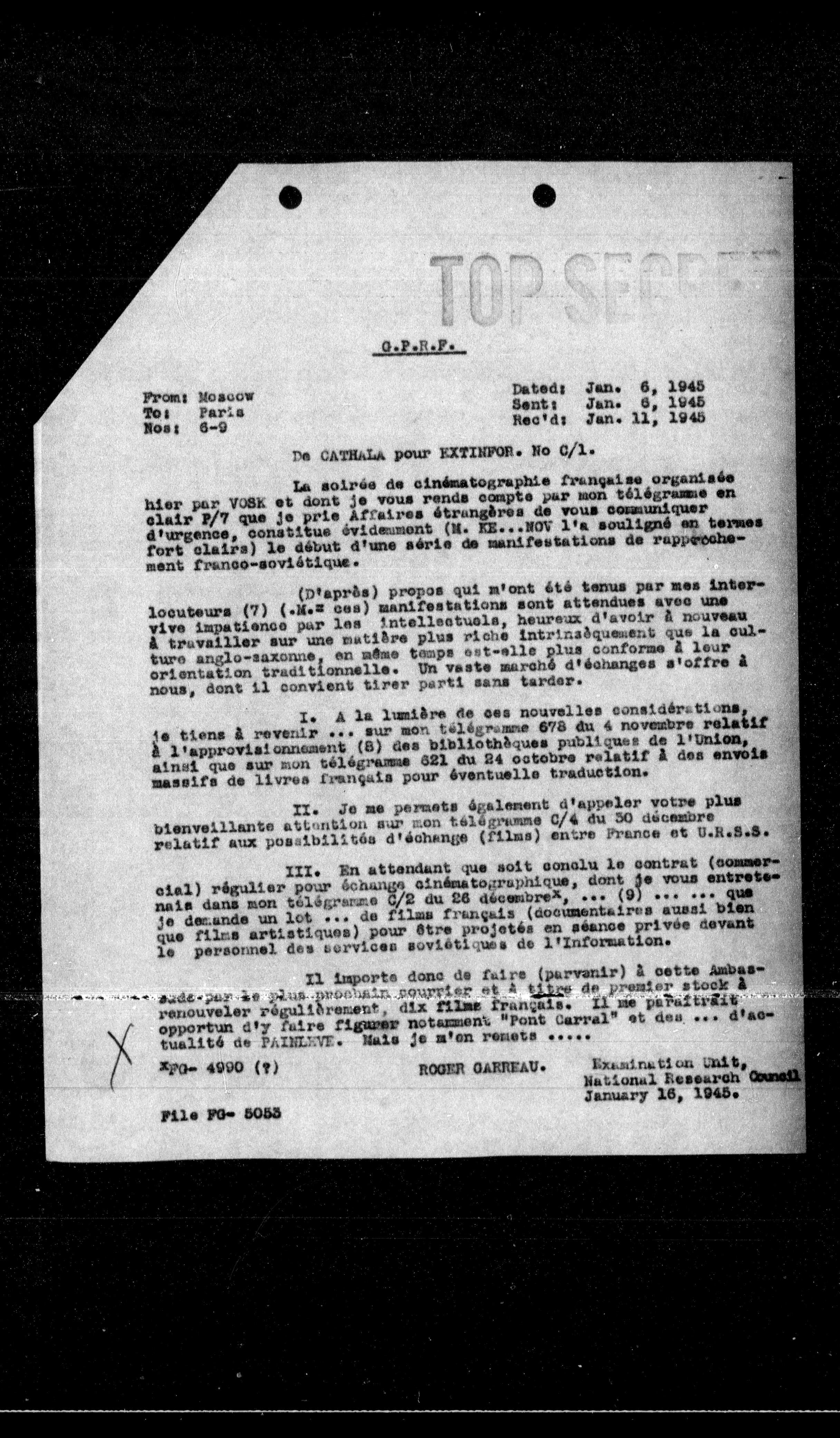 III. En attendant que soit conclu le contrat (commercial) régulier pour échange cinématographique, dont je vous entretenais dans mon télégramme C/2 du 26 décembre, (9) que je demande un lot de films français (documentaires aussi bien que films artistiques) pour être projetés en séance privée devant le personnel des services soviétiques de l'Information.