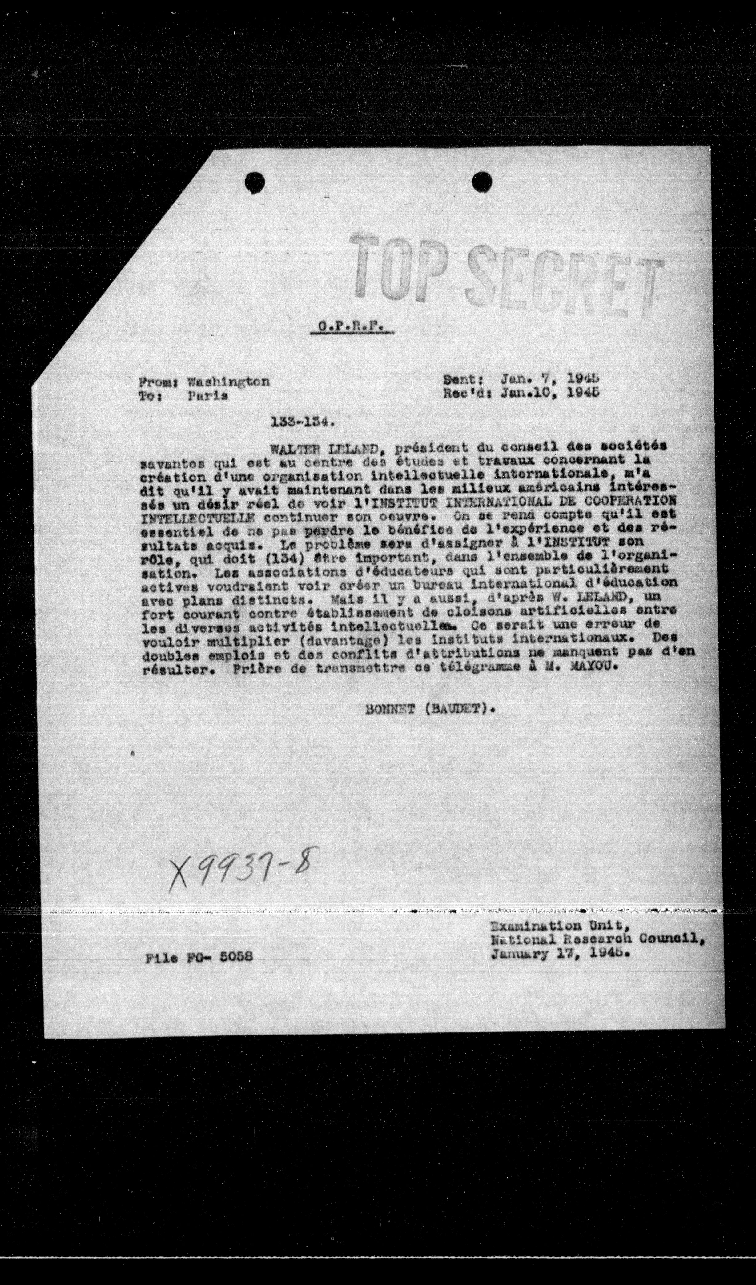 WALTER LELAND, président du conseil des sociétés savantes qui est au centre des études et travaux concernant la création d'une organisation intellectuelle internationale, m'a dit qu'il y avait maintenant dans les milieux américains intéressés un désir réel de voir l'INSTITUT INTERNATIONAL DE COOPERATION INTELLECTUELLE continuer son œuvre. On se rend compte qu'il est essentiel de ne pas perdre le bénéfice de l'expérience et des résultats acquis. Le problème sera d'assigner à l'INSTITUT son rôle, qui doit (134) être important, dans l'ensemble de l'organisation. Les associations d'éducateurs qui sont particulièrement actives voudraient voir créer un bureau international d'éducation avec plans distincts. Mais il y a aussi, d'après W. LELAND, un fort courant contre établissement de cloisons artificielles entre les diverses activités intellectuelles. Ce serait une erreur de vouloir multiplier (davantage) les instituts internationaux. Des doubles emplois et des conflits d'attributions ne manquent pas d'en résulter. Prise de transmettre ce télégramme à M. MAZOU.