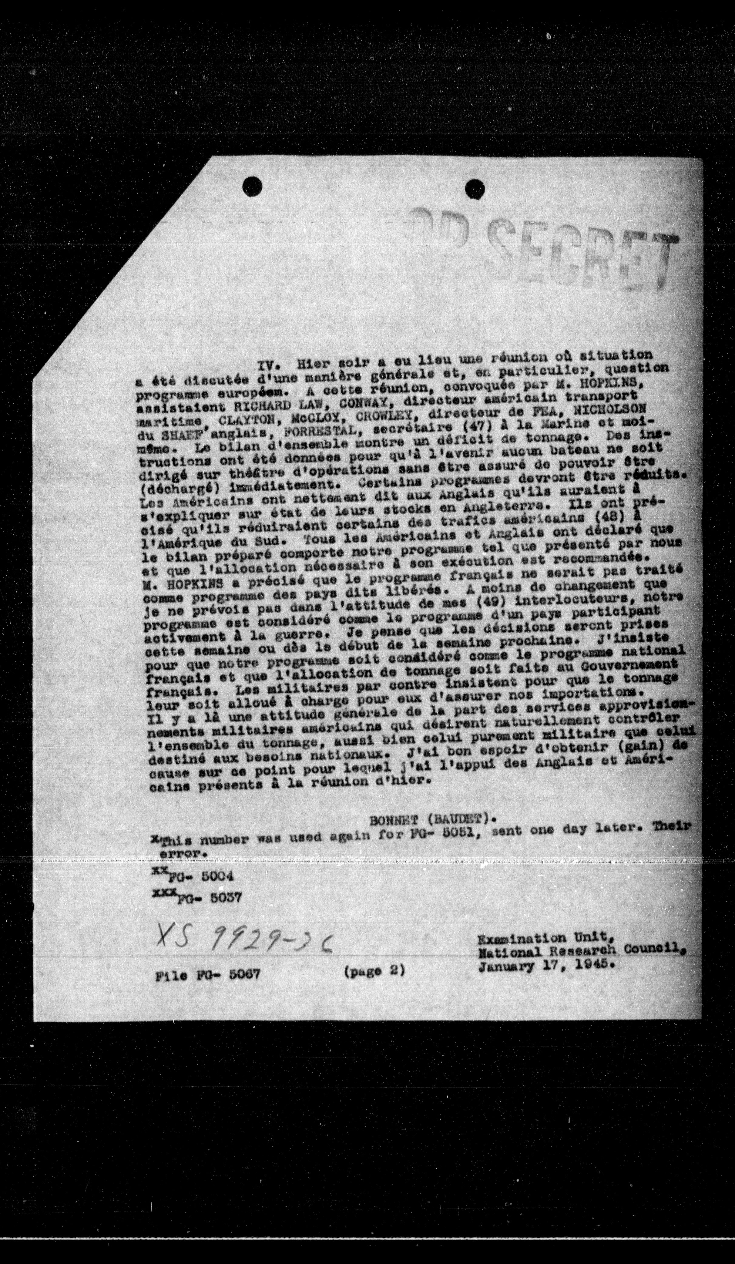 - IV. Hier soir a eu lieu une réunion of situation a été discutée d'une manière générale et, en particulier, question programe européen. A cette réunion, convoquée par M. HOPKINS, assistant RICHARD LAW, CONWAY, directeur américain transport maritime, CLATTOR, MCGLOT, CROWLEY, directeur de FEA, MICHOLSON du SHAFT anglais, FOREESTAL, secrétaire (47) à la Marine et moimême. Le bilan d'ensemble montre un déficit de tonnage. Des instructions ont été données pour qu'á l'avenir aucun bateau ne soit dirigé sur thêatre d'opérations sans être assuré de pouvoir être (déchargé) immédiatement. Certains programes devront être réduits. Les américains ont nettement dit aux anglais qu'ils auraient à s'expliquer sur état de leurs stocks en Angleterre. Ils ont précisé qu'ils réduiraient certains des trafics américains (48) à l'Amérique du Sud. Tous les Américains et Anglais ont déclaré que le bilan préparé comporte notre programme tel que présenté par nous et que l'allocation nécessaire à son exécution est recommandée. M. HOPKINS a précisé que le programme français ne serait pas traité comme programme des pays dits libérés. A moins de changement que je ne prévois pas dans l'attitude de mes (49) interlocuteurs, notre programme est considéré comme le programme d'un pays participant activement à la guerre. Je pense que les décisions seront prises cette semaine ou dès le début de la semaine prochaine. J'insiste pour que notre programme soit considéré comme le programme naturel français et que l'allocation de tonnage soit faite en Gouvernement français. Les militaires par contre insistent pour que le tonnage leur soit alloué à charge pour eux d'assurer nos importations. Il y a là une attitude générale de la part des services approvisionnements militaires américains qui désirent naturellement contrôler l'ensemble du tonnage, aussi bien celui purement militaire que qu'il destiné aux besoins nationaux. J'ai bon espoir d'obtenir (gain) de cause sur ce point pour lequel j'ai l'appui des Anglais et Américains présents à la réunion d'hier.