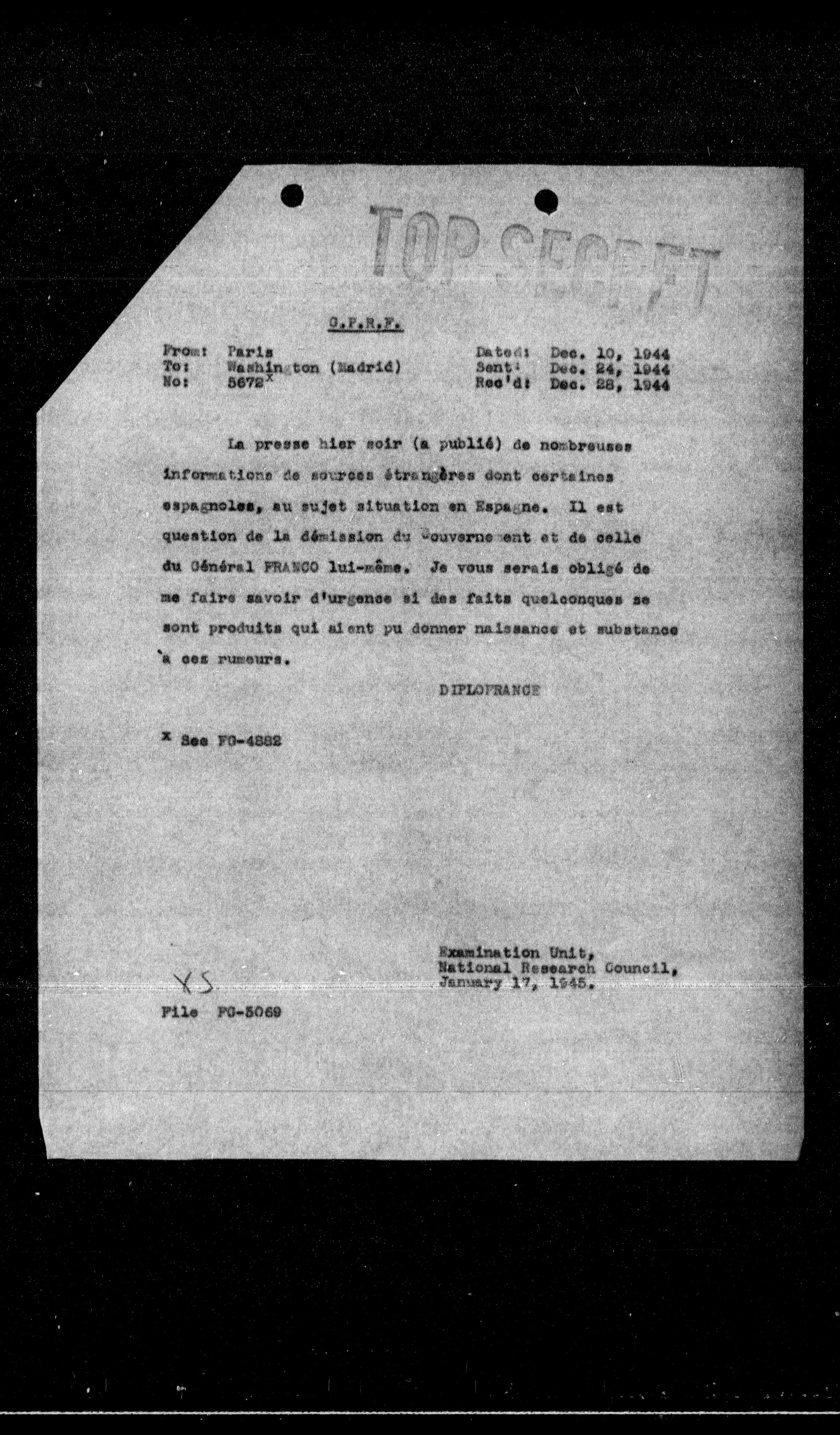 **From:** Paris **Date:** Dec. 10, 1944 **To:** Washington (Madrid) **Sent:** Dec. 24, 1944 **Re:** 5672 **Bac:** 28, 1944