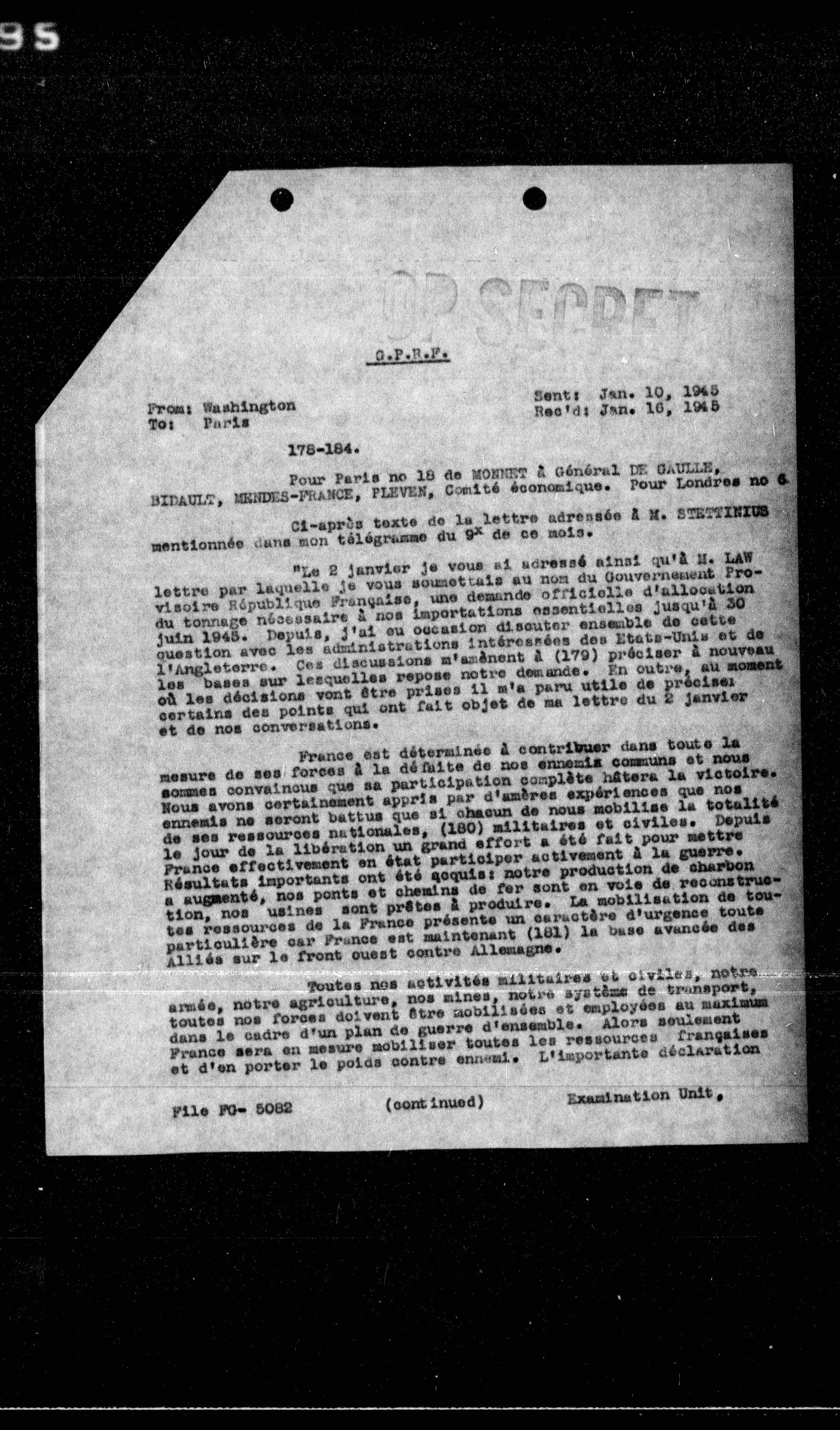France est déterminée à contribuer dans toute la mesure de ses forces à la défaite de nos ennemis communs et nous sommes convaincus que sa participation complète luttera la victoire. Nous avons certainement appris par d'autres expériences que nos ennemis ne seront battus que si chacun de nous mobilise la totalité de ses ressources nationales, (180) militaires et civiles. Depuis le jour de la libération un grand effort a été fait pour mettre France effectivement en état participer activement à la guerre. Résultats importants ont été acquis: notre production de charbon a augmenté, nos ponts et chemins de fer sont en voie de reconstruction, nos usines sont prêtes à produire. La mobilisation de toutes les ressources de la France présente un caractère d'urgence toute particulière car France est maintenant (181) la base avancée des Alliés sur le front ouest contre Allemagne.