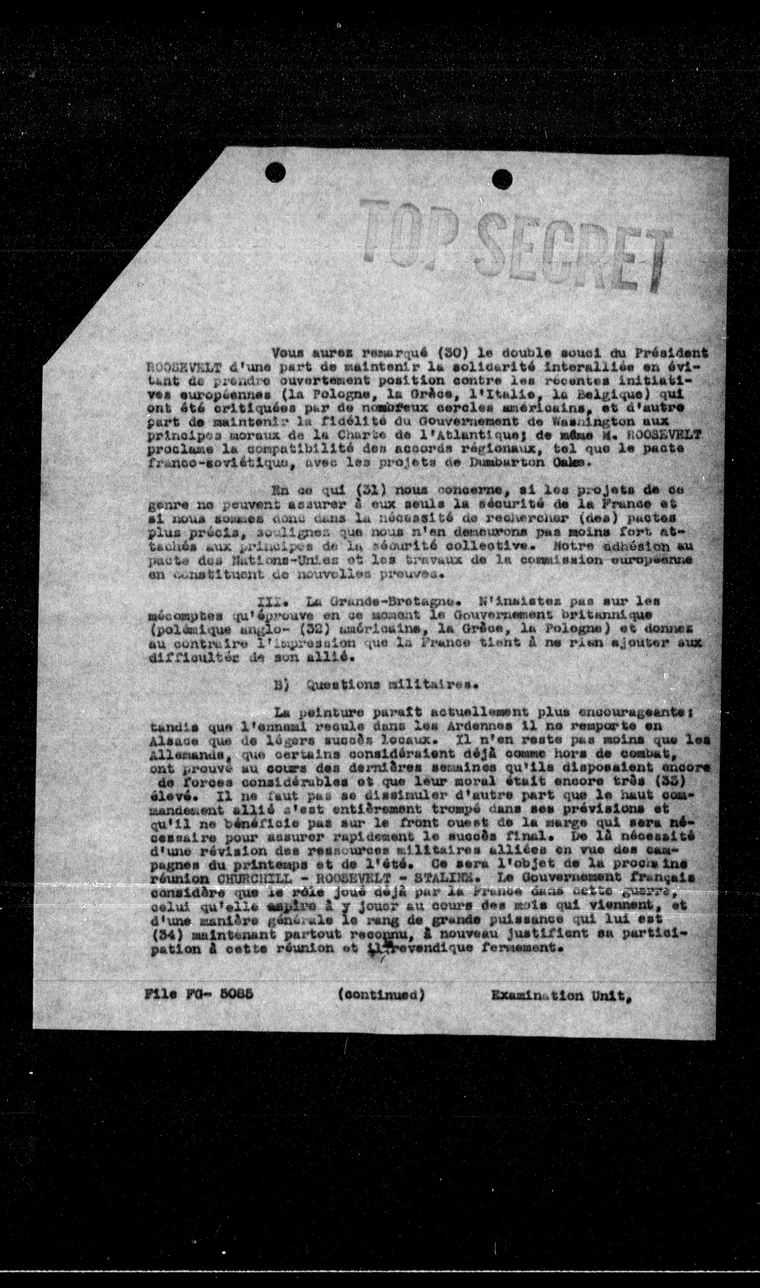 La peinture paraît actuellement plus encourageante : tandis que l'ennemi recule dans les Ardennes il ne remporte en Alsace que de légers succès locaux. Il n'en reste pas moins que les Allemands, que certains considéraient déjà comme hors de combat, ont prouvé au cours des dernières semaines qu'ils disposaient encore de forces considérables et que leur moral était encore très (32) élevé. Il ne faut pas se dissimuler d'autre part que le haut commandement allié s'est entièrement trompé dans ses prévisions et qu'il ne bénéficie pas sur le front ouest de la marge qui sera nécessaire pour assurer rapidement le succès final. De là nécessité d'une révision des ressources militaires alliées en vue des campagnes du printemps et de l'été. Ce sera l'objet de la prochaine réunion CHURCHILL - ROOSEVELT - STALINS. Le Gouvernement français considère que le rôle joué déjà par la France dans cette guerre, celui qu'elle inspire à y jouer au cours des mois qui viennent, et d'une manière générale le rang de grande puissance qui lui est (34) maintenant partout reconnu, à nouveau justifiant sa participation à cette réunion et l'irrevendique fermement.