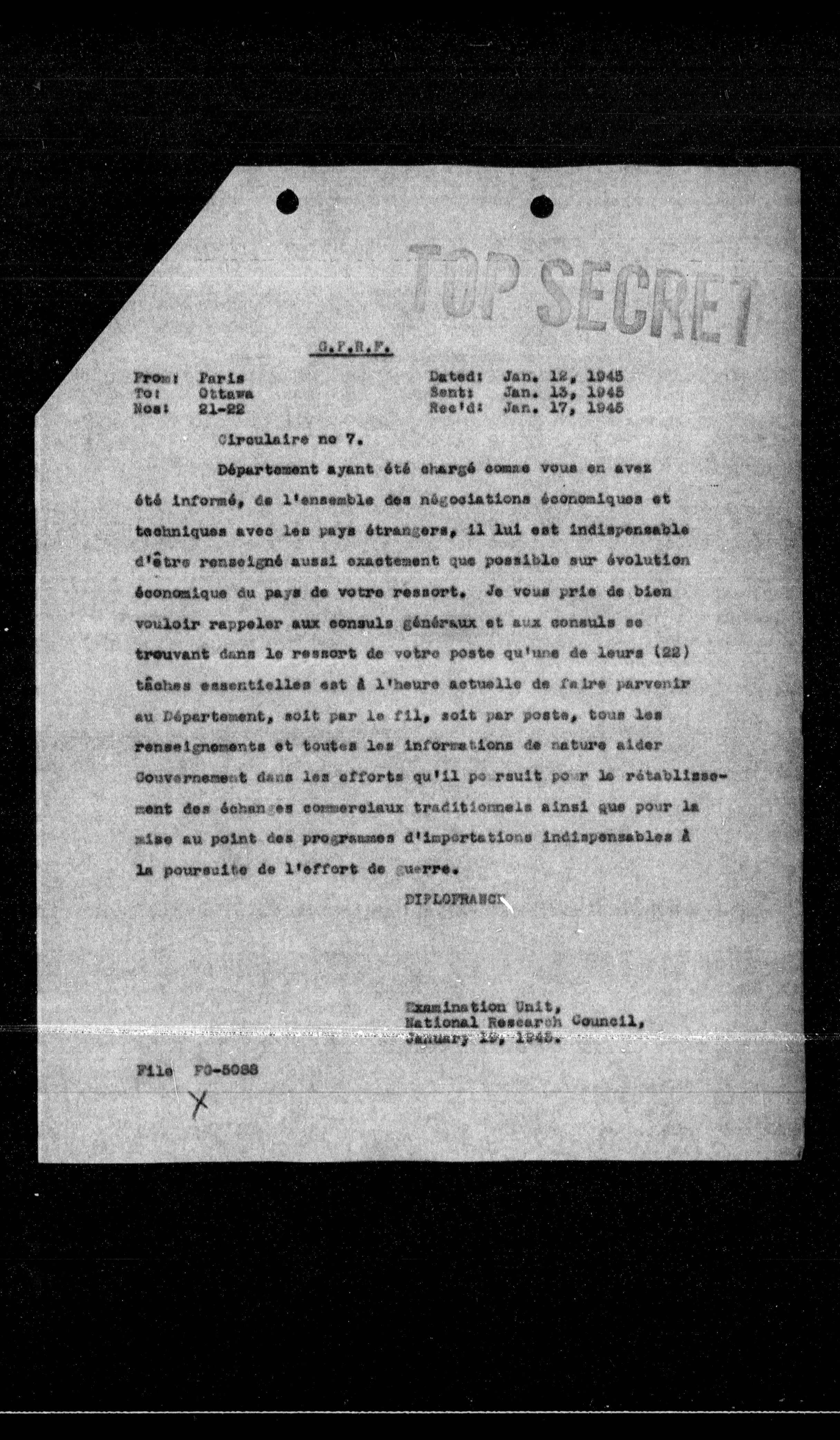 **Dated:** Jan. 12, 1945 **Sent:** Jan. 15, 1945 **Reeld:** Jan. 17, 1945
