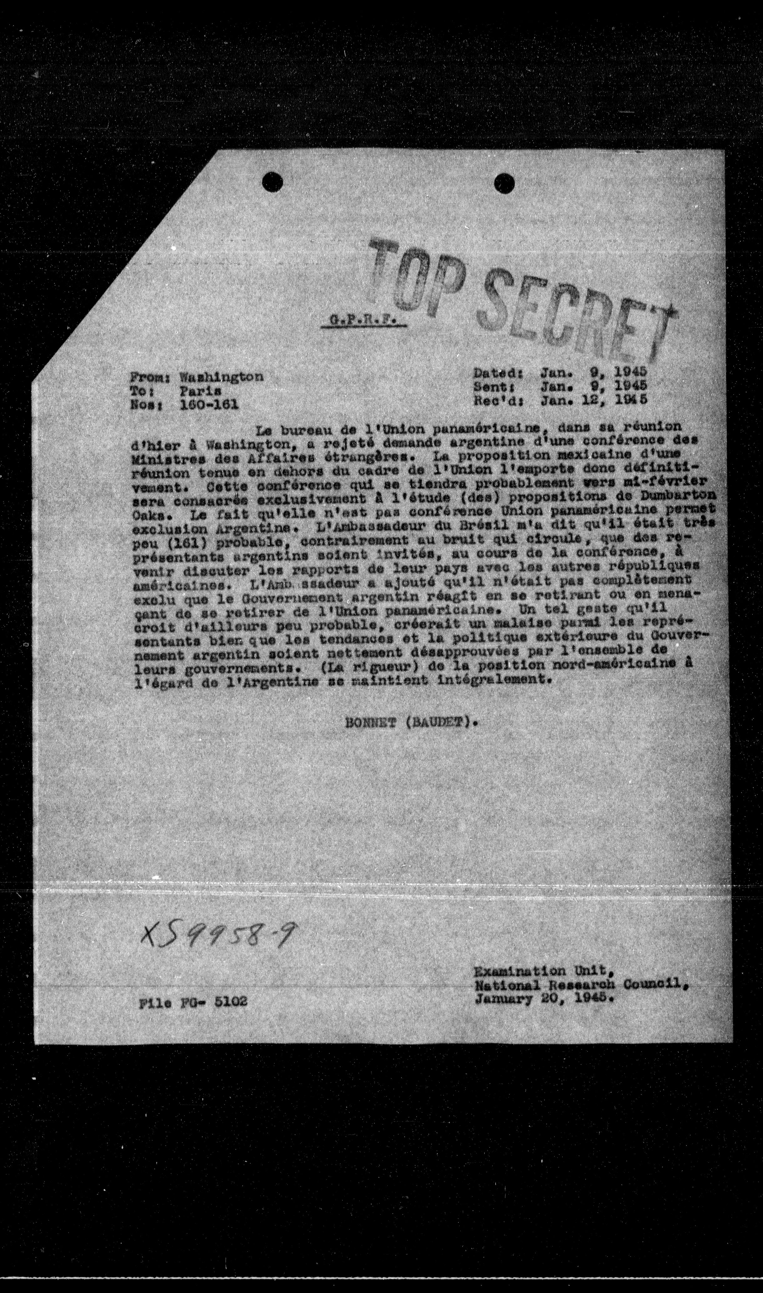 Le bureau de l'Union panaméricaine, dans sa réunion d'hier à Washington, a rejeté demande argentine d'une conférence des Ministres des Affaires étrangères. La proposition mexicaine d'une réunion tenue en dehors du cadre de l'Union l'exemple donc définitivement. Cette conférence qui se tiendra probablement sera ci-dessus sera consacrée exclusivement à l'étude (des) propositions de Dumbarton Oaks. Le fait qu'elle n'est pas conférence Union panaméricaine permet exclusion Argentine. L'Ambuscateur du Brésil n'a dit qu'il était très peu (161) probable, contrairement au bruit qui circule, que des représentants argentins soient invités, au cours de la conférence, à venir discuter les rapports de leur pays avec les autres régulières américaines. L'Ambuscateur a ajouté qu'il n'était pas complètement exclu que le Gouvernement argentin réagit en se retirant ou en menaçant de se retirer de l'Union panaméricaine. Un tel geste qu'il croit d'ailleurs peu probable, créerait un malaise parmi les représentants bien que les tendances et la politique extérieure du Gouvernement argentin soient nettement désapprouvées par l'ensemble de leurs gouvernements. (La rigueur) de la position nord-américaine à l'égard de l'Argentine se maintient intégralement.