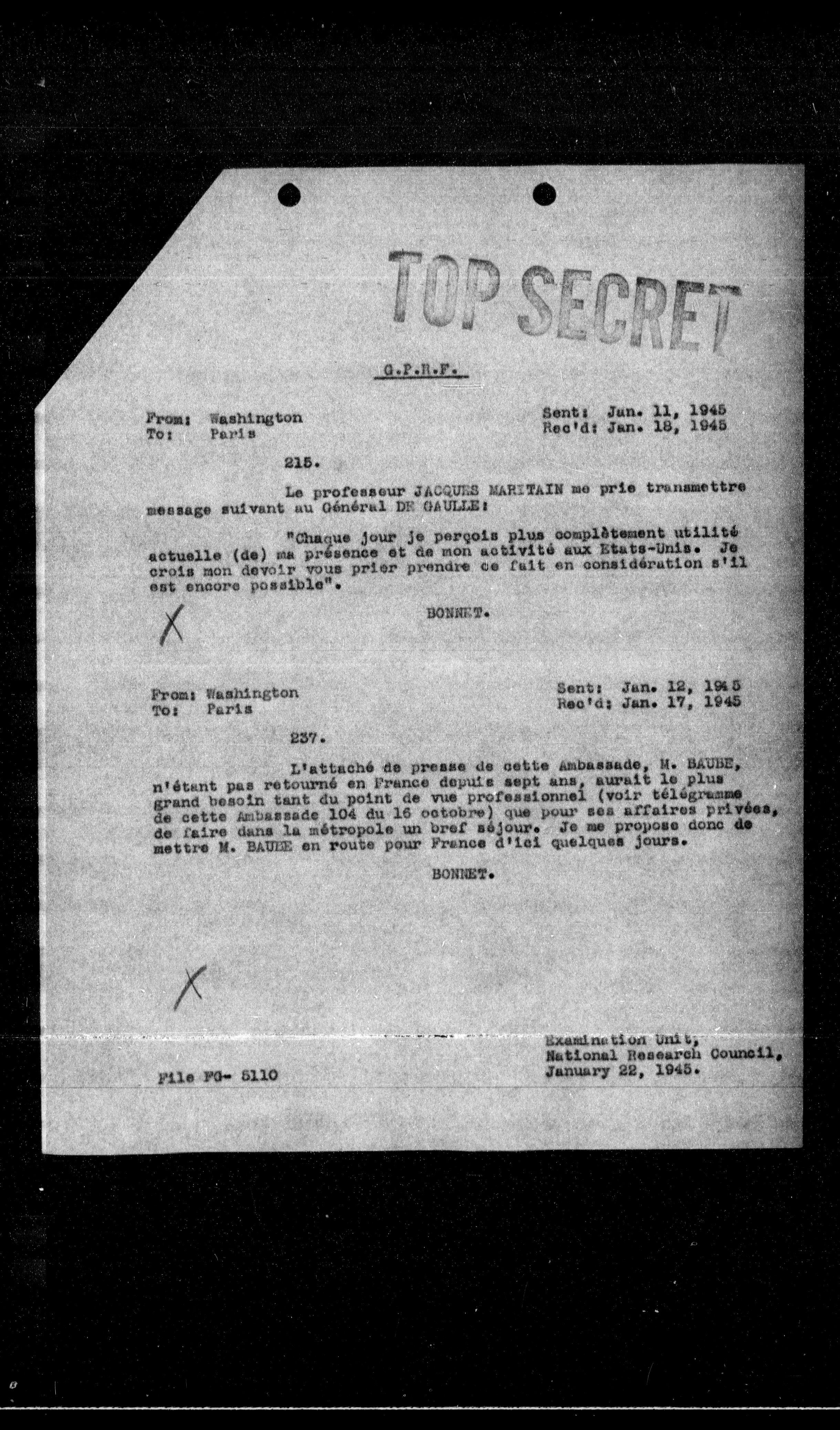 Le professeur JACQUES MARITAIN me prie transmettre message suivant au Général DE GAULLE:
