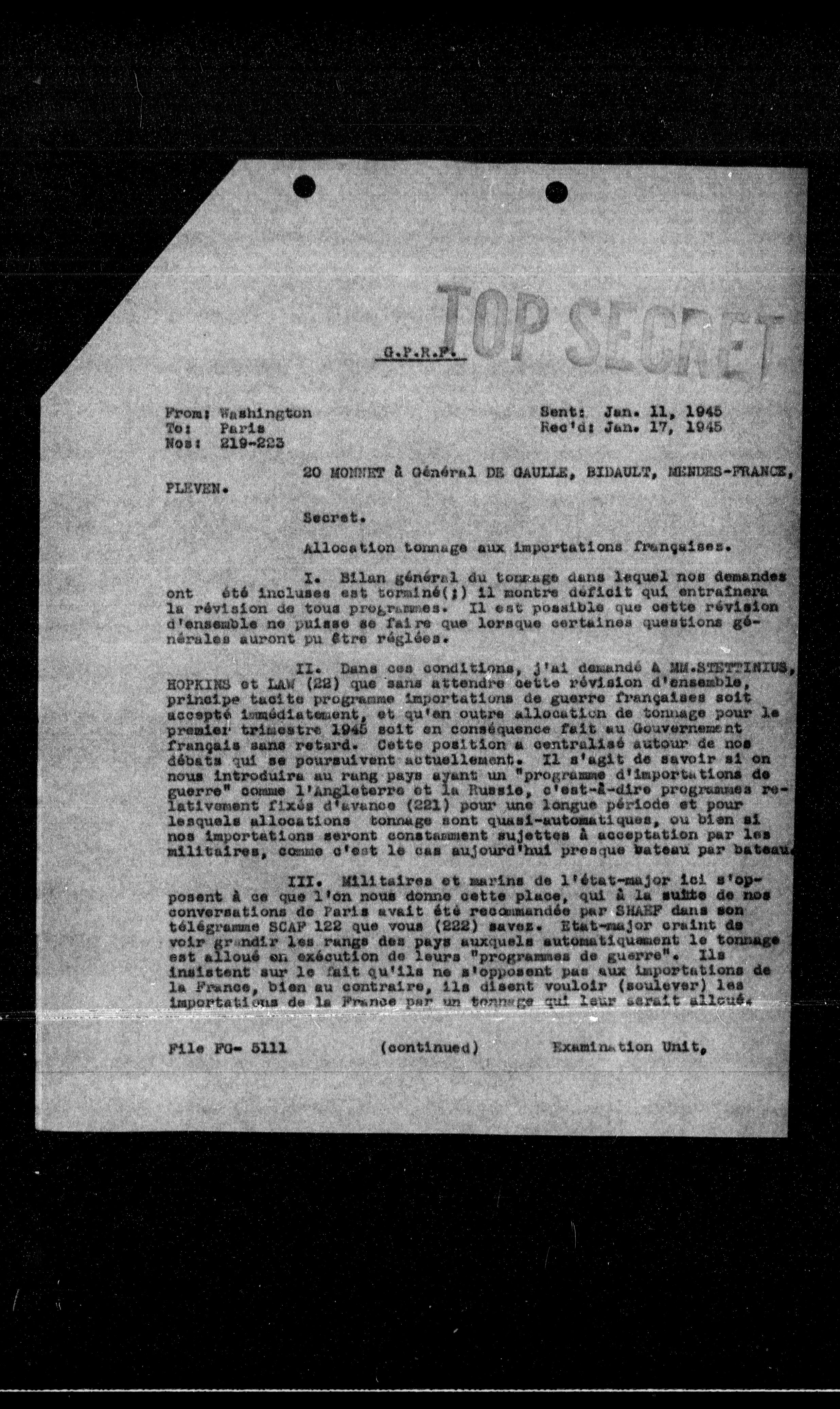 III. Militaires et marins de l'état-major ici s'opposent à ce que l'on nous donne cette place, qui à la suite de nos conversations de Paris avait été recommandée par SRAEF dans son télégramme SCAP 122 que vous (222) savez. Et si ce qui a été donné, vous devez vous dire que vous n'avez pas eu de place, mais vous n'avez pas eu de place. Il y a un certain nombre de cas qui sont en cours de l'exécution de leurs "programmes de guerre". Ils insistent sur le fait qu'ils ne s'opposent pas aux importations de la France, bien au contraire, ils disent vouloir (souléver) les importations de la France par un tonnage qui leur serait alloué.
