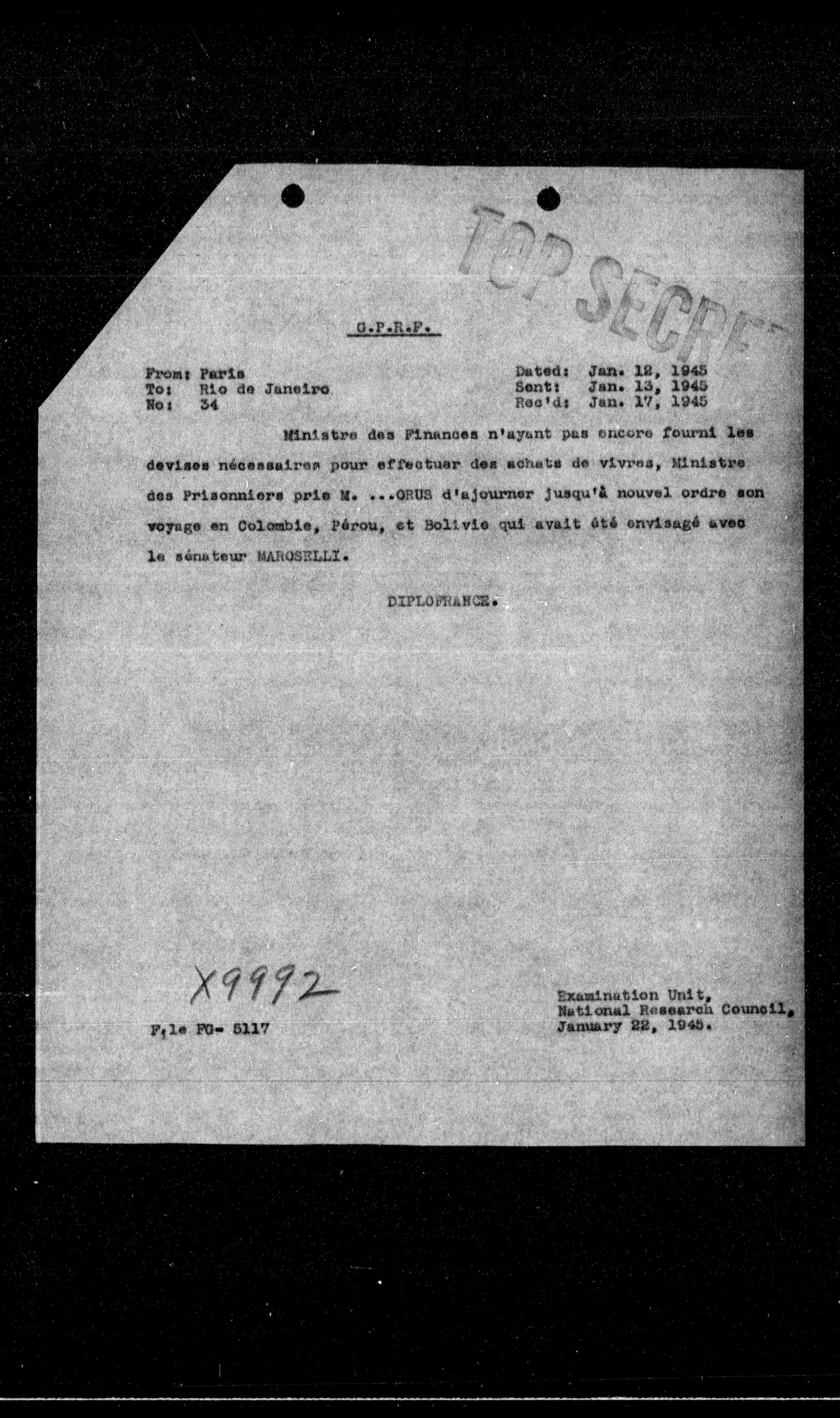 **From:** Paris **To:** Rio de Janeiro **No:** 34
