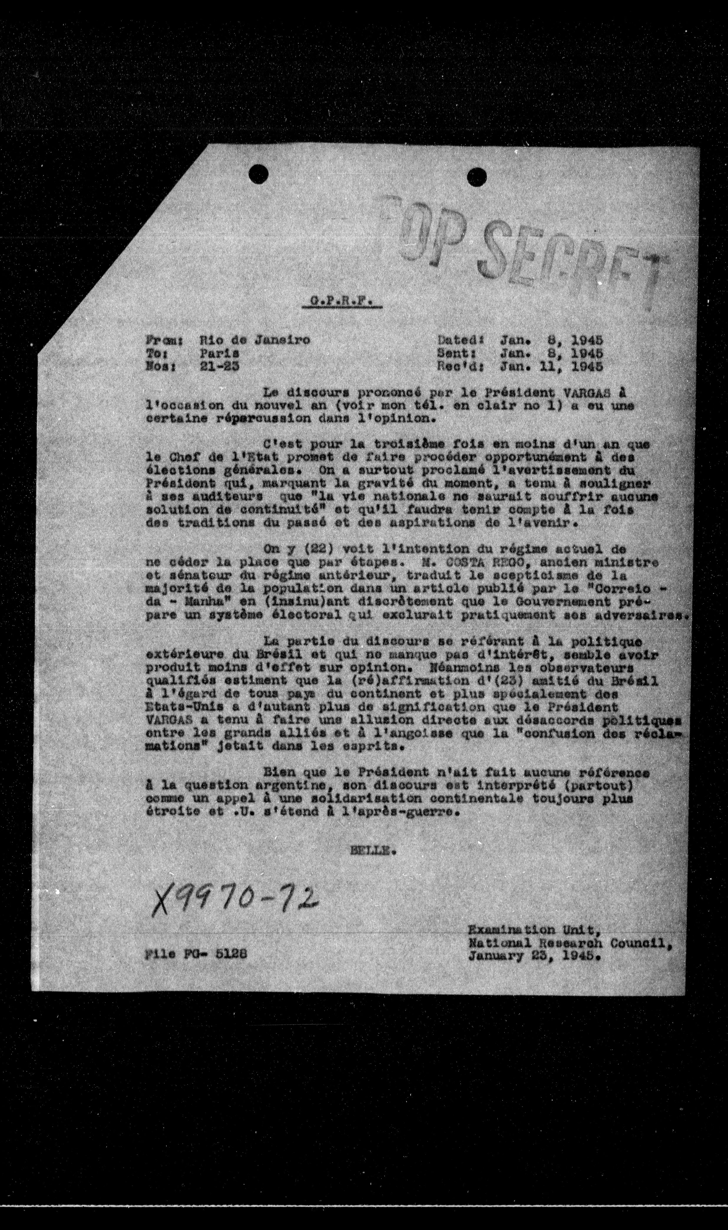 Le discours prononcé par le Président VARGAS a l'occasion du nouvel an (voir mon tel. en clair no 1) a eu une certaine répercussion dans l'opinion.