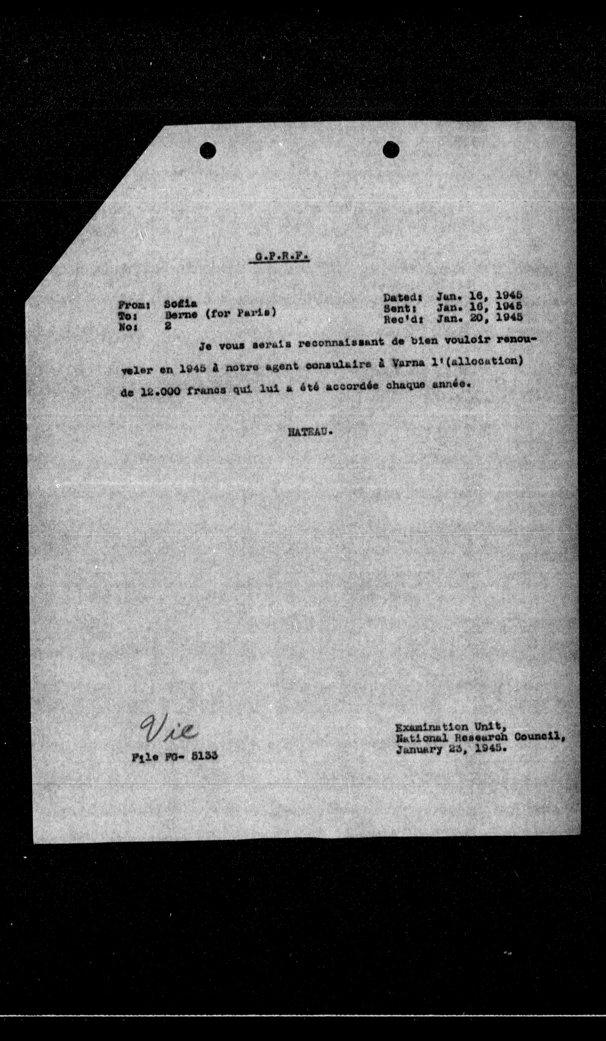 Je vous serais reconnaissant de bien vouloir renouveler en 1945 à notre agent consulaires à Varna l'(allocation) de 12.000 francs qui lui a été accordée chaque année.