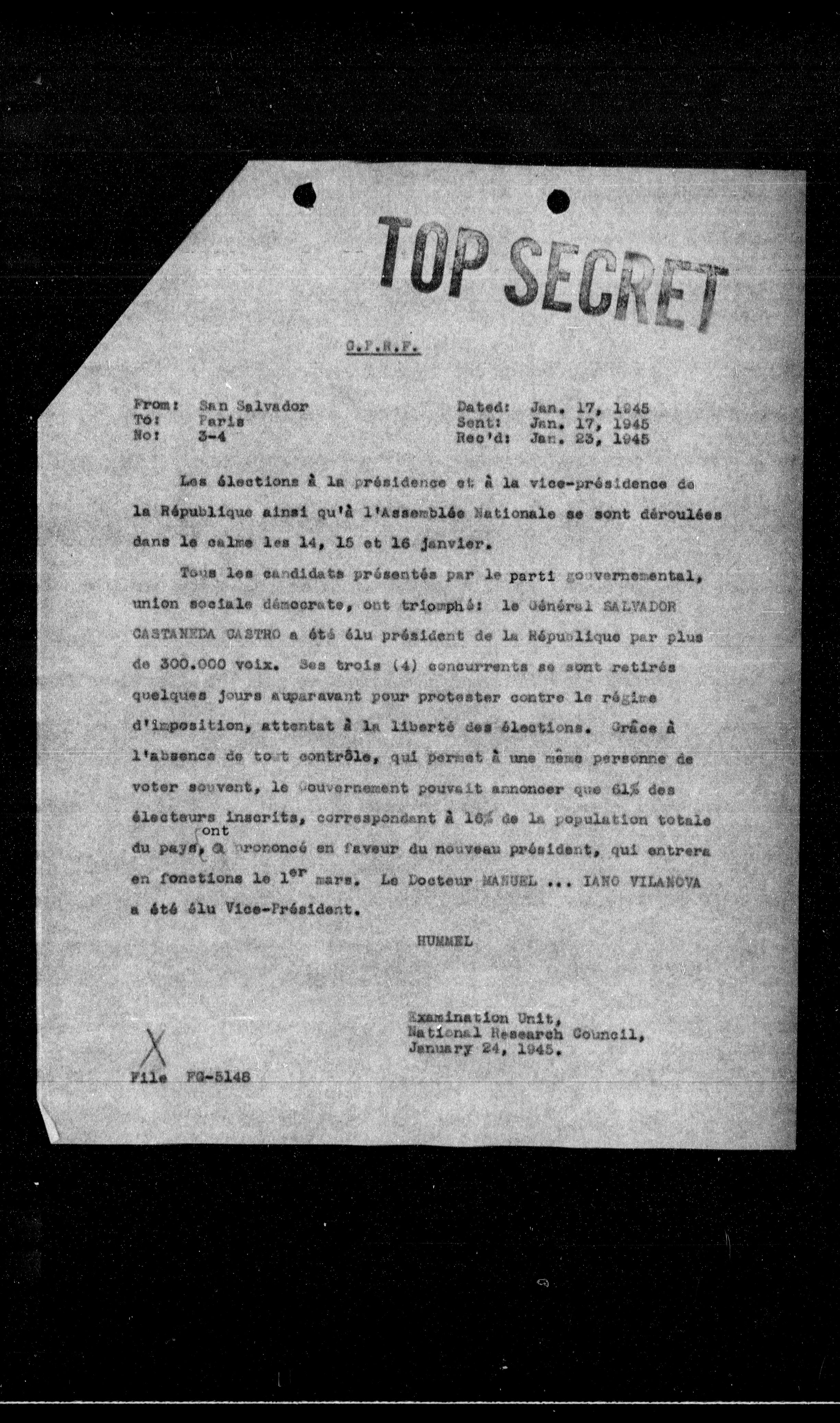 Tous les candidats présentés par le parti gouvernemental, union sociale démocrate, ont triomphé: le Général SALVADOR GASTANEDA CASTRO a été élu président de la République par plus de 300.000 voix. Ses trois (4) concurrents se sont retirés quelques jours auparavant pour protester contre le régime d'imposition, attentat à la liberté des élections. Grâce à l'absence de tout contrôle, qui permet à une même personne de voter souvent, le Gouvernement pouvait annoncer que 61% des électeurs inscrits, correspondant à 16% de la population totale du pays, se prononcé en faveur du nouveau président, qui entrera en fonctions le 1er mars. Le Docteur MANUEL ... IANO VILANOVA a été élu Vice-Président.