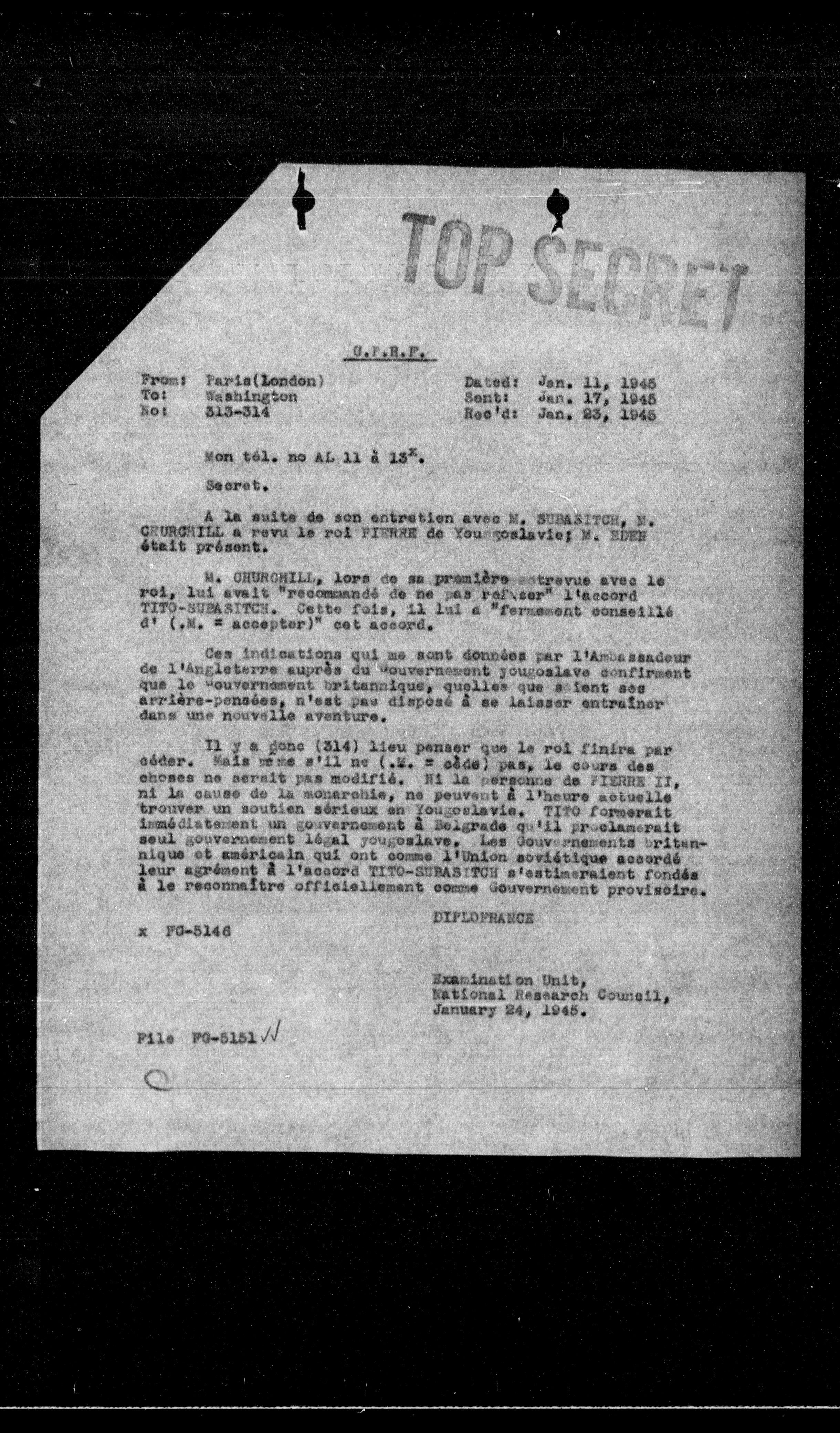 M. CHURCHILL, lors de sa première entrevue avec le roi, lui avait "recommandé de ne pas refuser" l'accord TITO-SURASITCH. Cette fois, il lui a "fermenté conseillé d' (M. * accepter)" cet accord.