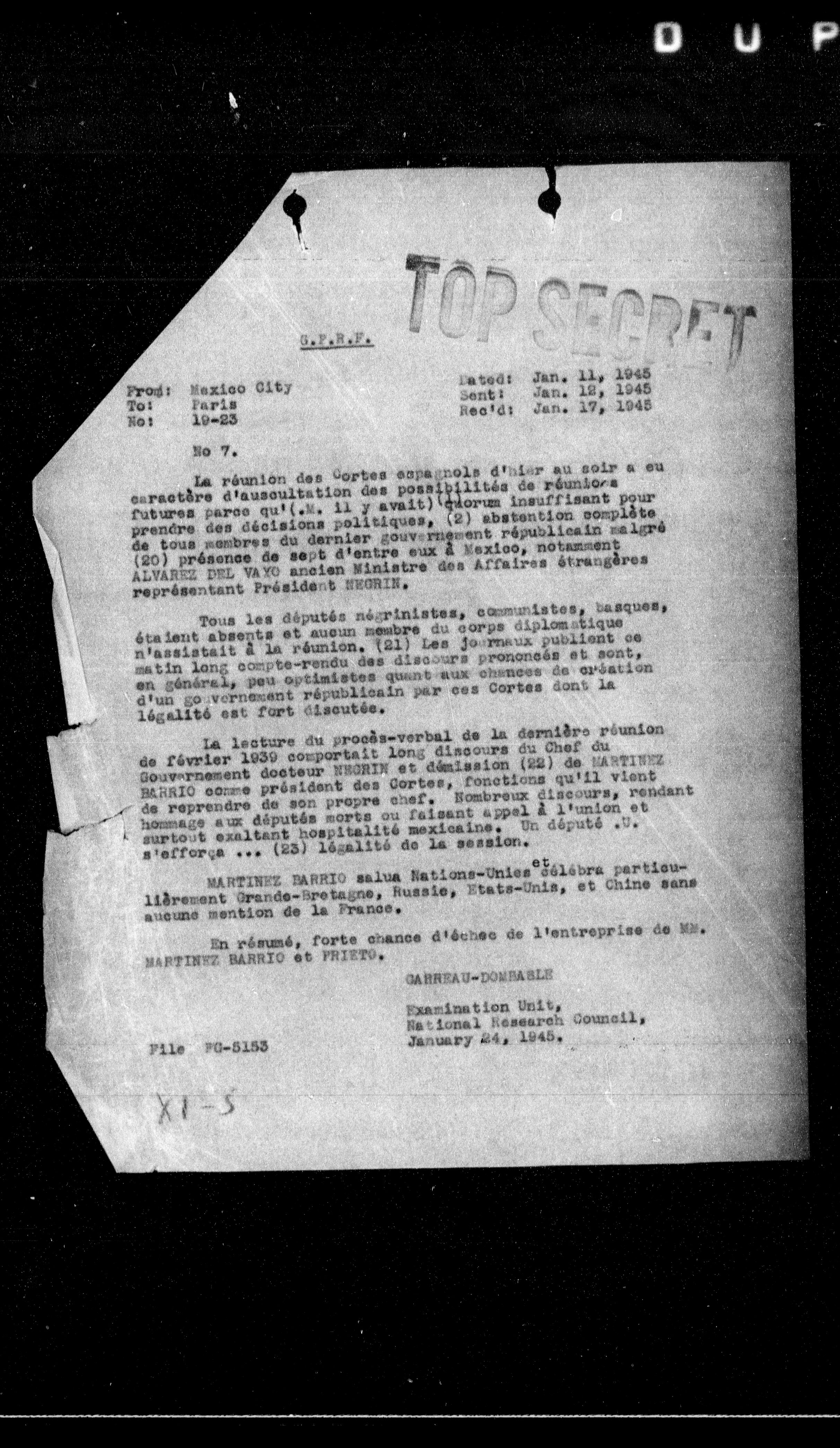 La réunion des "ortes eapagnols d'hier au soir a eu caractere d'auscultation des possibilités de réunio a futures parce qu' (..m. il y avait) 'quorum insuffisant pour prendre des décisions politiques, (2) abstention complète de tous membres du dernier gouvernement républicain malgré (20) prósense de sept d'entre eux a Mexico, notamment ALVAREZ DEL VAYO ancien Ministre des Affaires étrangères représentant Président NEGRIS.