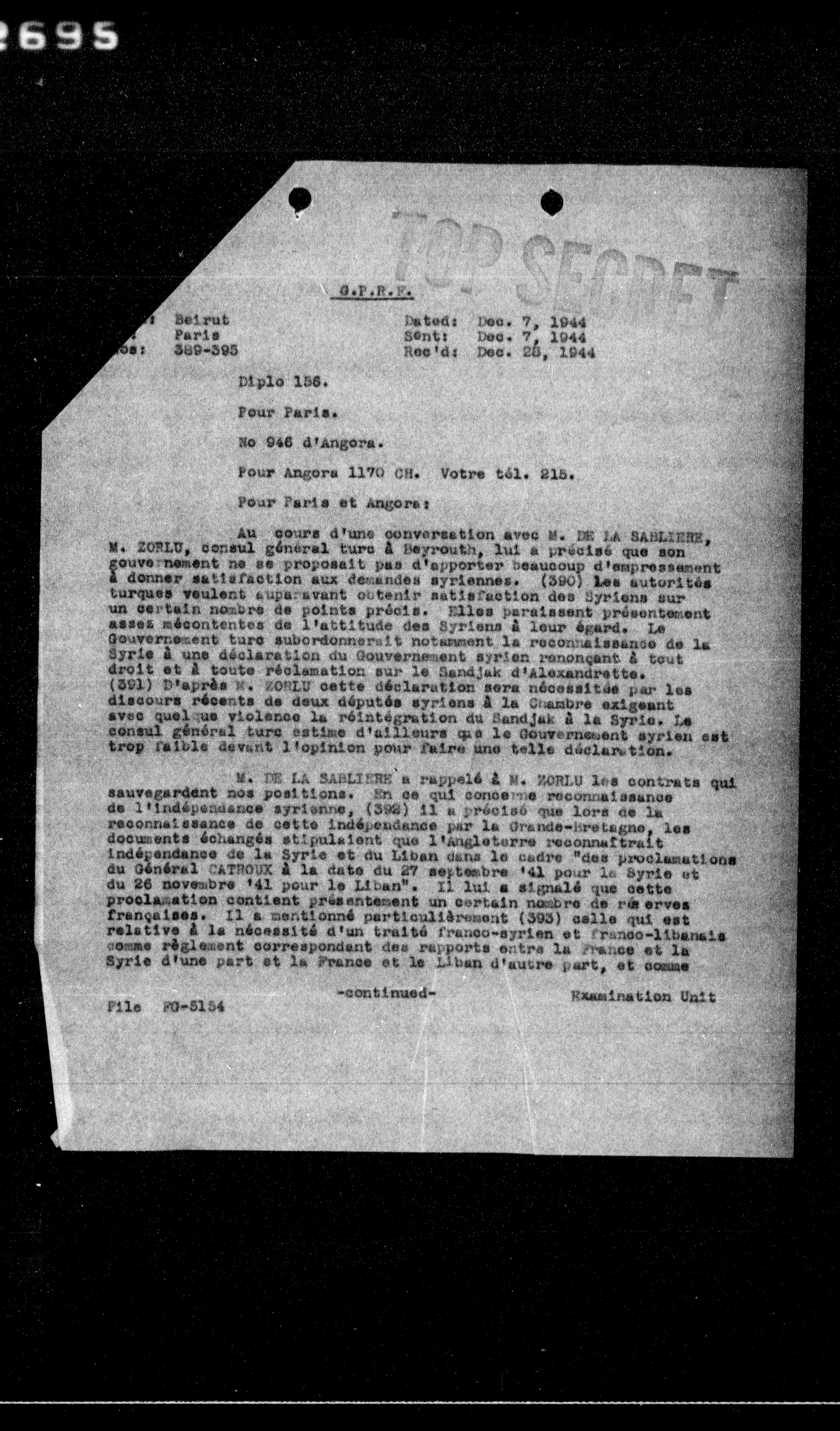 Au cours d'une conversation avec M. DE LA SABLIERE, M. ZORLU, consul général ture à Beyrouth, lui a précisé que son gouvernement ne se proposait pas d'apporter beaucoup d'emprisonnement à donner satisfaction aux demandes syriennes. (390) Les autorités turques veulent auparavant obtenir satisfaction des Syriens sur un certain nombre de points précis. Elles paraissent présentement assez mécontentes de l'attitude des Syriens à leur égard. Le Gouvernement ture subordonnerait notamment la reconnaissance de la Syrie à une déclaration du Gouvernement syrien renonçant à tout droit et à toute réclamation sur le Sandjak d'Alexandrette. (391) D'après M. ZORLU cette déclaration sera nécessité par les discours récents de deux députés syriens à la Chambre exigeant avec quelque violence la réintégration du Sandjak à la Syrie. Le consul général ture estime d'ailleurs que le Gouvernement syrien est trop faible devant l'opinion pour faire une telle déclaration.