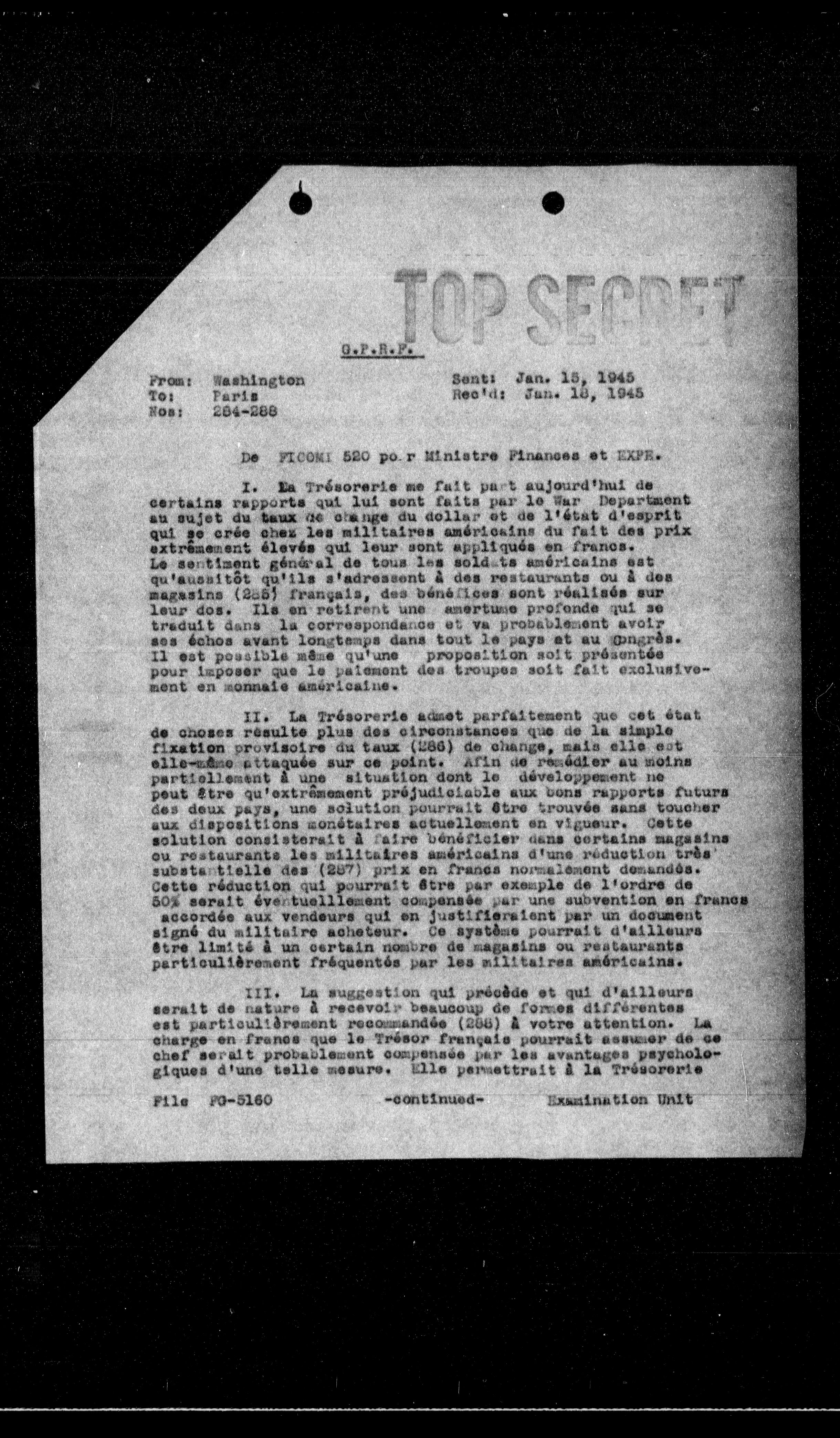 I. La Trésorerie me fait part aujourd'hui de certains rapports qui lui sont faits par le War Department au sujet du taux de change du dollar et de l'état d'esprit qui se crée chez les militaires américains du fait des prix extrêmement élevés qui leur sont appliqués en France. Le sentiment général de tous les soldats américains est qu'aussitôt qu'ils s'adressent à des restaurants ou à des magasins (285) français, des bénéfices sont réalisés sur leur dos. Ils en retirent une amertume profonde qui se traduit dans la correspondance et va probablement avoir ses échos avant longtemps dans tout le pays et au Congrès. Il est possible même qu'une proposition soit présentée pour imposer que le paiement des troupes soit fait exclusivement en monnaie américaine.