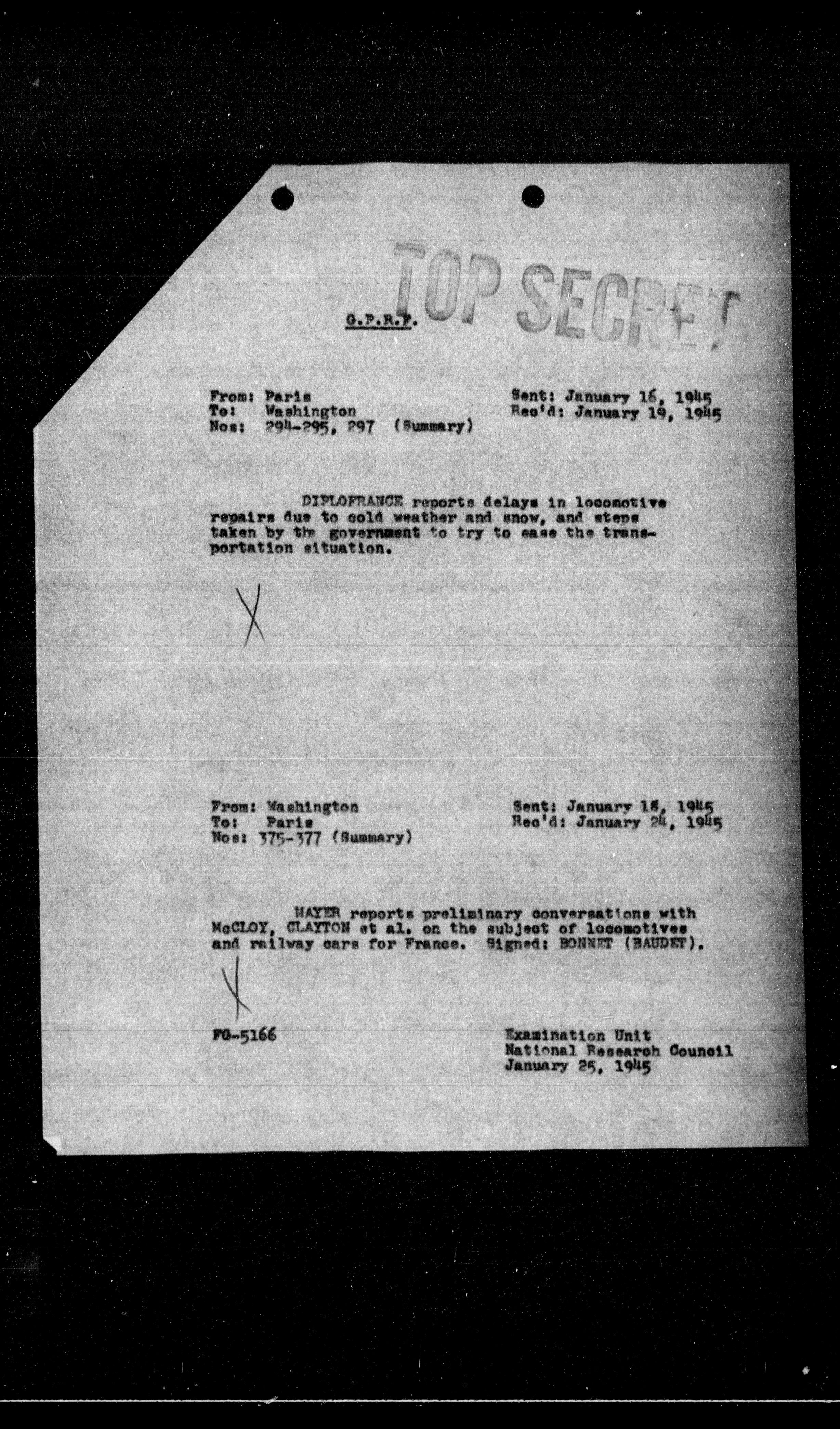 MAYER reports preliminary conversations with McCLOY, CLAYTON et al. on the subject of locomotives and railway cars for France. Signed: BONNET (BAUDET).