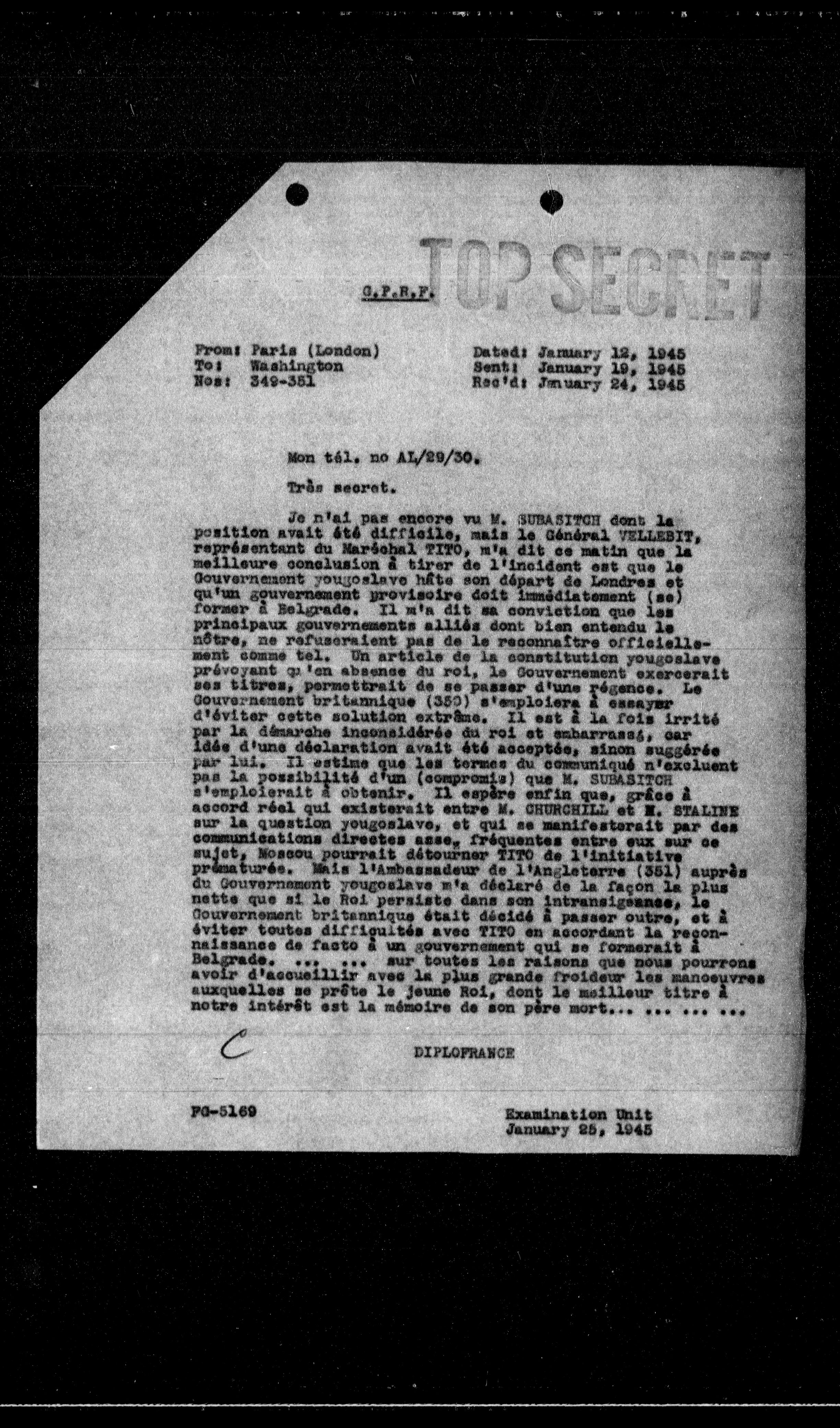 Je n'ai pas encore vu W. SURASIFUS dont la position avait été difficile, mais le Général VERREDI, représentant du Maréchal TITO, m'a dit ce matin que la meilleure conclusion a tirer de l'incident est que le Gouvernement yougoslave mète son départ de Londres et qu'un gouvernement provisoire doit immédiatement (se) former à Belgrade. Il m'a dit sa conviction que les principaux gouvernements alliés dont bien entendu le nôtre, ne refuseraient pas de le reconnaître officiellement comme tel. Un article de la constitution yougoslave prévoyant qu'en absence du roi, le Gouvernement exercerait ses titres, permetrait de se passer d'une rigueur. Le Gouvernement britannique (350) s'emploiera à essayer d'éviter cette solution extrême. Il est à la TOLs irrité par la démarche inconsidérée du roi et embarcant, car idée d'une déclaration avait été acceptée, sinon suggérée par lui. Il estime que le terme du communiqué n'excluent pas la possibilité d'un (compromis) que W. SURASIFUS s'emploierait à obtenir. Il espère enfin que, grâce à accord réel qui existerait entre W. SURASIFILL et W. STALINE sur la question yougoslave, et qui se manifesteraif par des communications directes assez fréquentes entre eux sur ce sujet, lebou pourrait détonner TITO de l'initiative principale. Mais l'inhansement de l'Angleterre (200) auprès du Gouvernement yougoslave m'a déclaré de la façon la plus nette que si le Roi persiste dans son intransigeance, le Gouvernement britannique était décidé à passer outre, et à éviter toutes difficultés avec TITO en accordant la reconnaissance de facto à un gouvernement qui se formerait à Belgrade. ... ... sur toutes les raisons que nous pourrons avoir d'accueillir avec la plus grande froideur les manœuvres auxquelles se prête le jeune Roi, dont le meilleur titre a notre intérêt est la mémoire de son père mort... ... ... ...