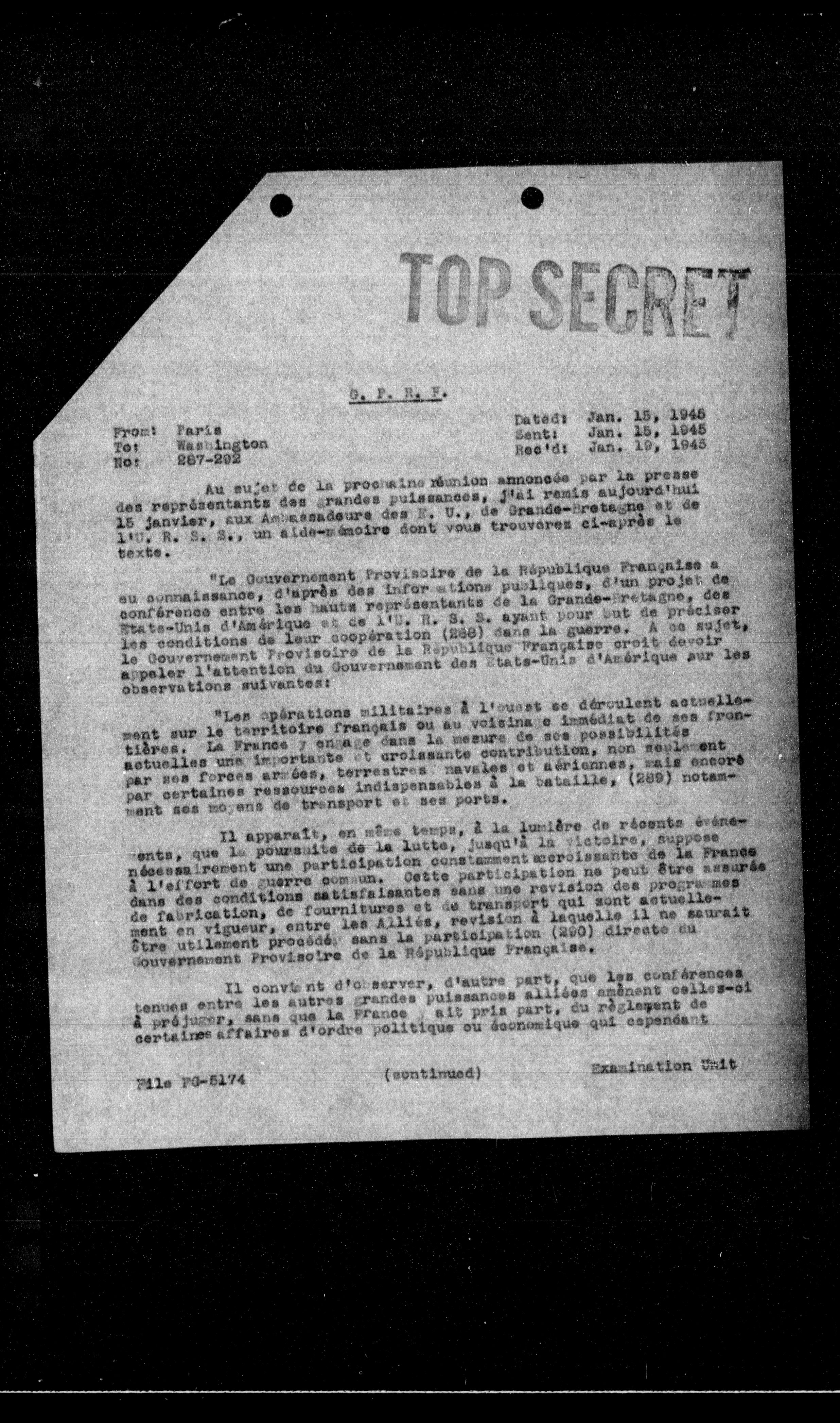 "Le Gouvernement Provisoire de la République Française a eu connaissance, d'après des informations publiques, d'un projet de conférence entre les hauts représentants de la Grande-Bretagne, des Etats-Unis d'Amérique et de l'U. R. S. S. ayant pour but de préciser les conditions de leur coopération (288) dans la guerre. À ce sujet, le Gouvernement Provisoire de la République Française croit devoir appeler l'attention du Gouvernement des Etats-Unis d'Amérique sur les observations suivantes: