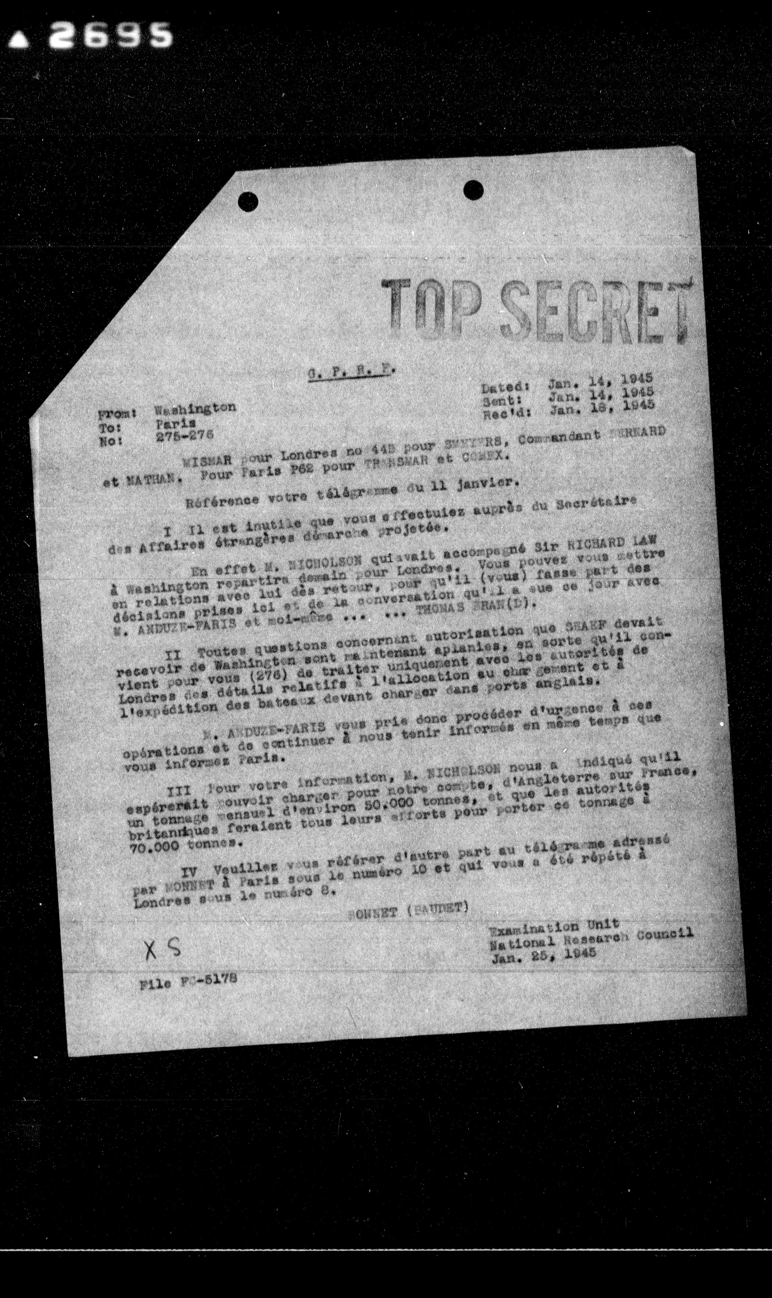 III. Pour votre information, **M. NICHOLSON** nous a indiqué qu'il espérerait pouvoir charger pour notre compte, d'Angleterre sur France, un tonnage mensuel d'environ 50.000 tonnes, et que les autorités britanniques feraient tous leurs efforts pour porter ce tonnage à 70.000 tonnes.