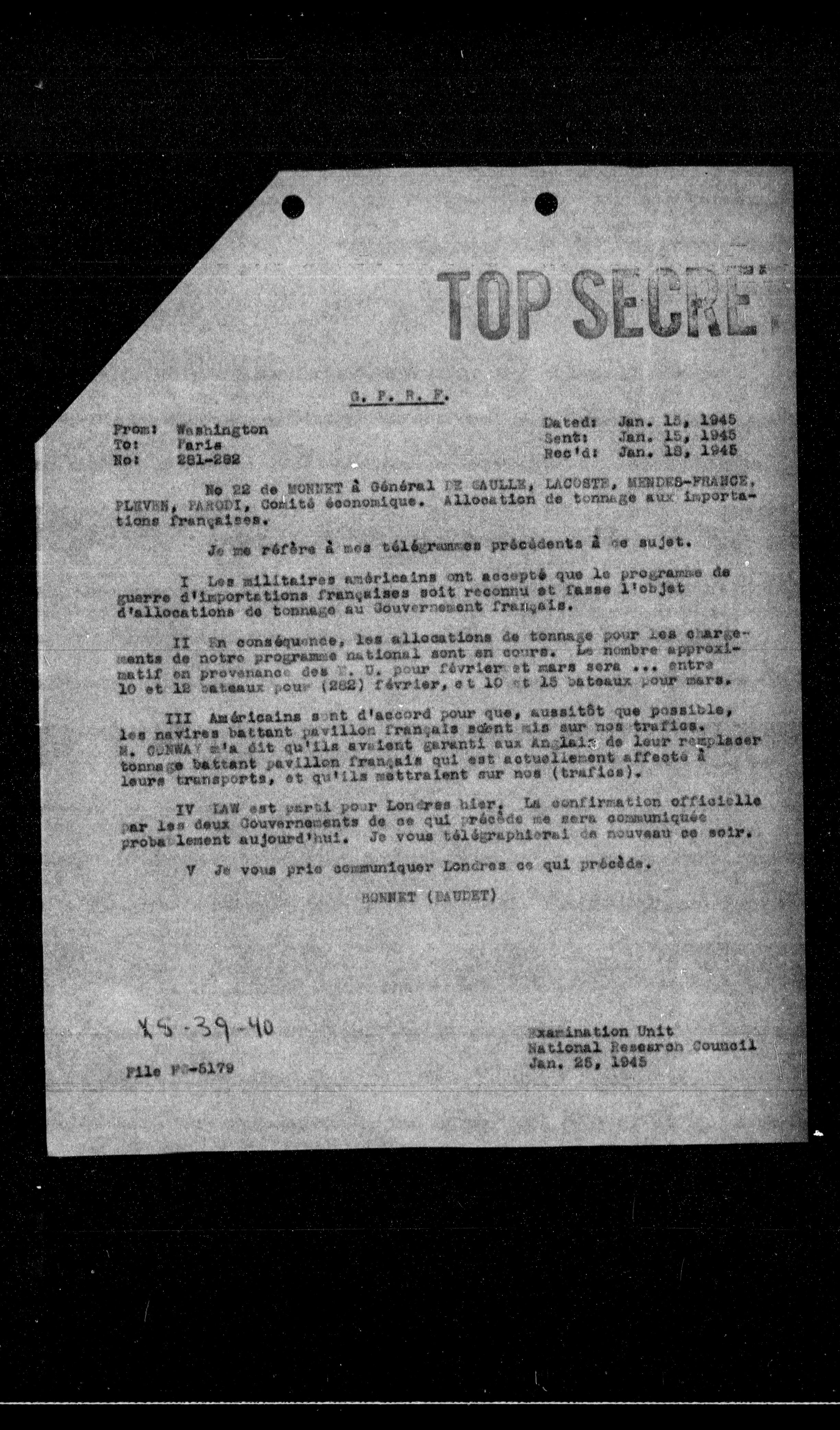 III Américains sont d'accord pour que, aussitôt que possible, les navires battant pavillon français soient mis sur nos trafics. R. COBEAY m'a dit qu'ils avaient garanti aux Anglais de leur remplacer tonnage battant pavillon français qui est actuellement affecté à leurs transports, et qu'ils matraient sur nos (trafics).