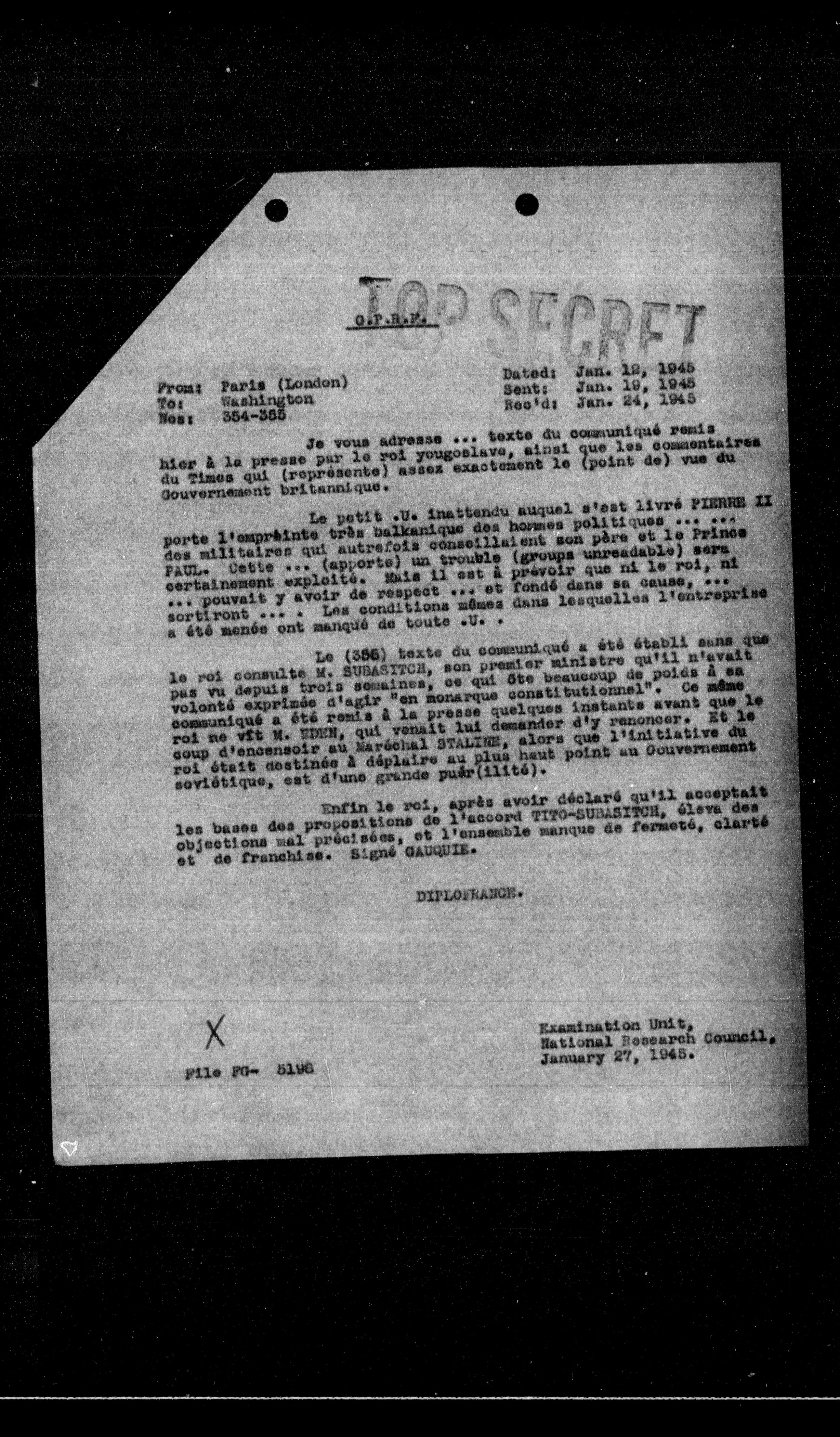 Enfin le roi, après avoir déclaré qu'il acceptait les bases des propositions de l'accord TITO-SURBATTON, élève des objections mal précisées, et l'ensemble manque de fermeté, clarté et de franchise. Signé GARRETE.