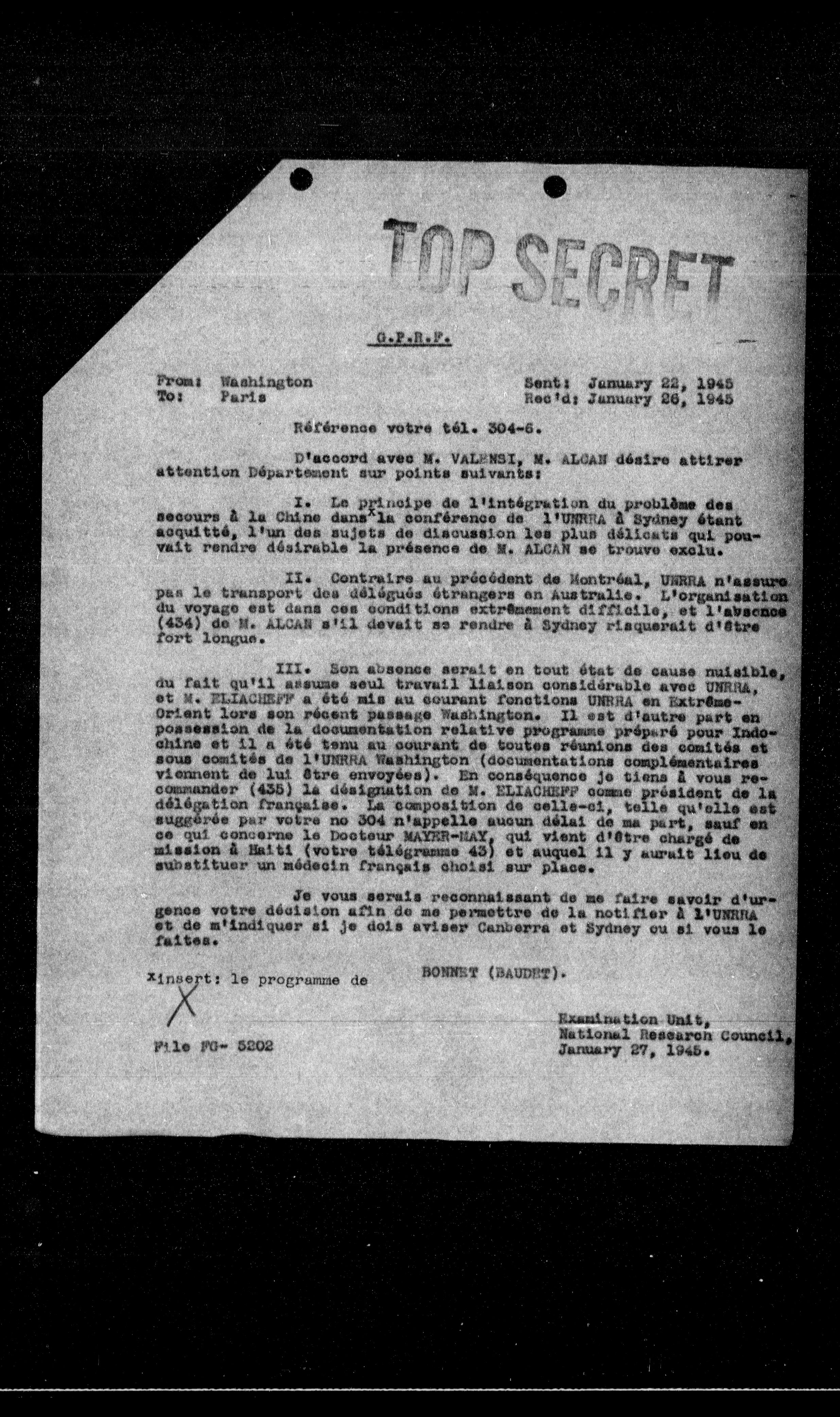 III. Son absence serait en tout état de cause invisible, du fait qu'il assume seul travail liaison considérable avec UNRRA, et M. ELIACHER a été mis au courant fonctions UNRRA en Extreme-Orient lors son récent passage Washington. Il est d'autre part en possession de la documentation relative programme préparé pour Indochine et il a été tenu au courant de toutes réunions des comités et sous-comités de l'UNRRA Washington (documentations complémentaires viennent de lui être envoyées). En conséquence je tiens à vous recommander (435) la désignation de M. ELIACHER comme président de la délégation française. La composition de celle-ci, telle qu'elle est suggérée par votre no 304 n'appelle aucun délai de ma part, sauf en ce qui concerne le Docteur MAGER-NAT, qui vient d'être chargé de mission à Haiti (votre téléphone 43) et auquel il y aurait lieu de substituer un médecin français choisi sur place.