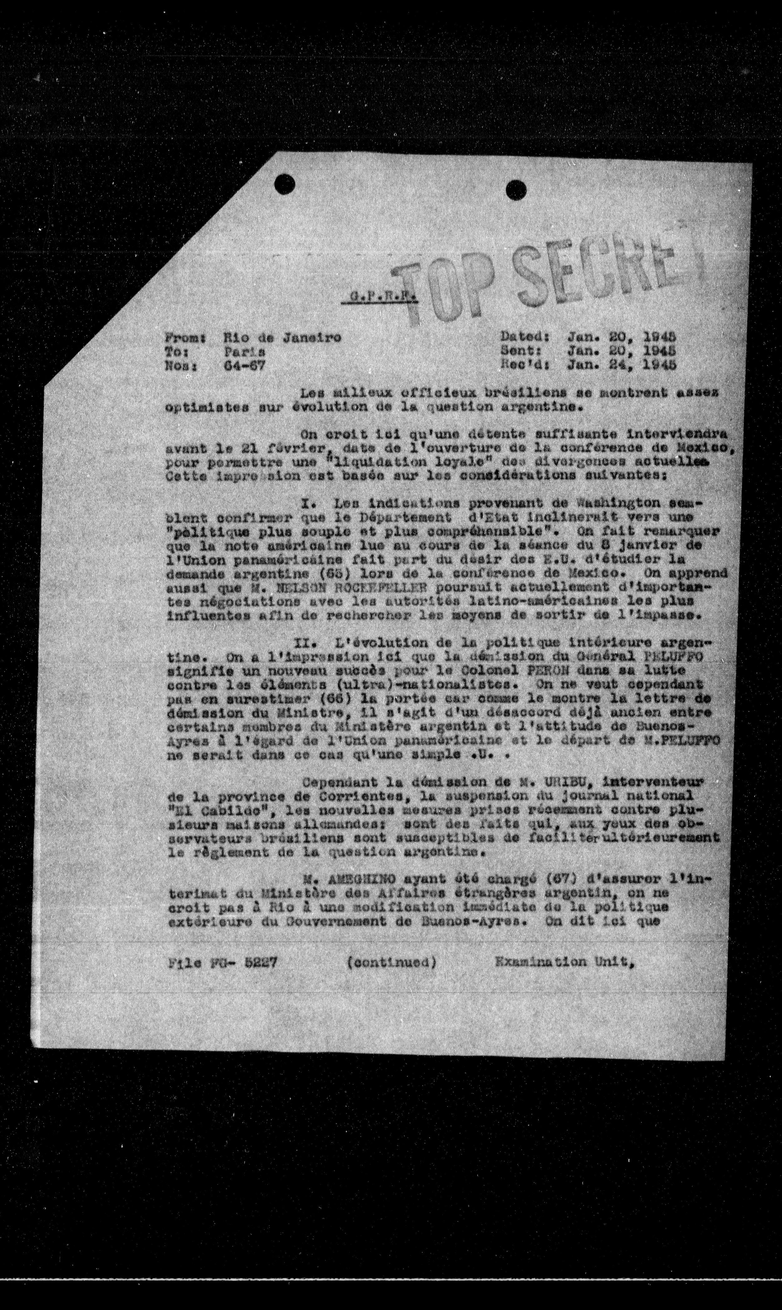 I. Les indications provenant de Washington semblent confirmer que le Département d'État inclinerait vers une "politique plus souple et plus compréhensible". On fait remarquer que la note américaine lue au cours de la séance du 8 janvier de l'Union panaméricaine fait part du désir des E.U. d'étudier la demande argentine (68) lors de la conférence de Mexico. On apprend aussi que M. MELSON HOCKEYFILLEN poursuit actuellement d'importantes négociations avec les autorités latino-américaines les plus influentes afin de rechercher les moyens de sortir de l'impasse.