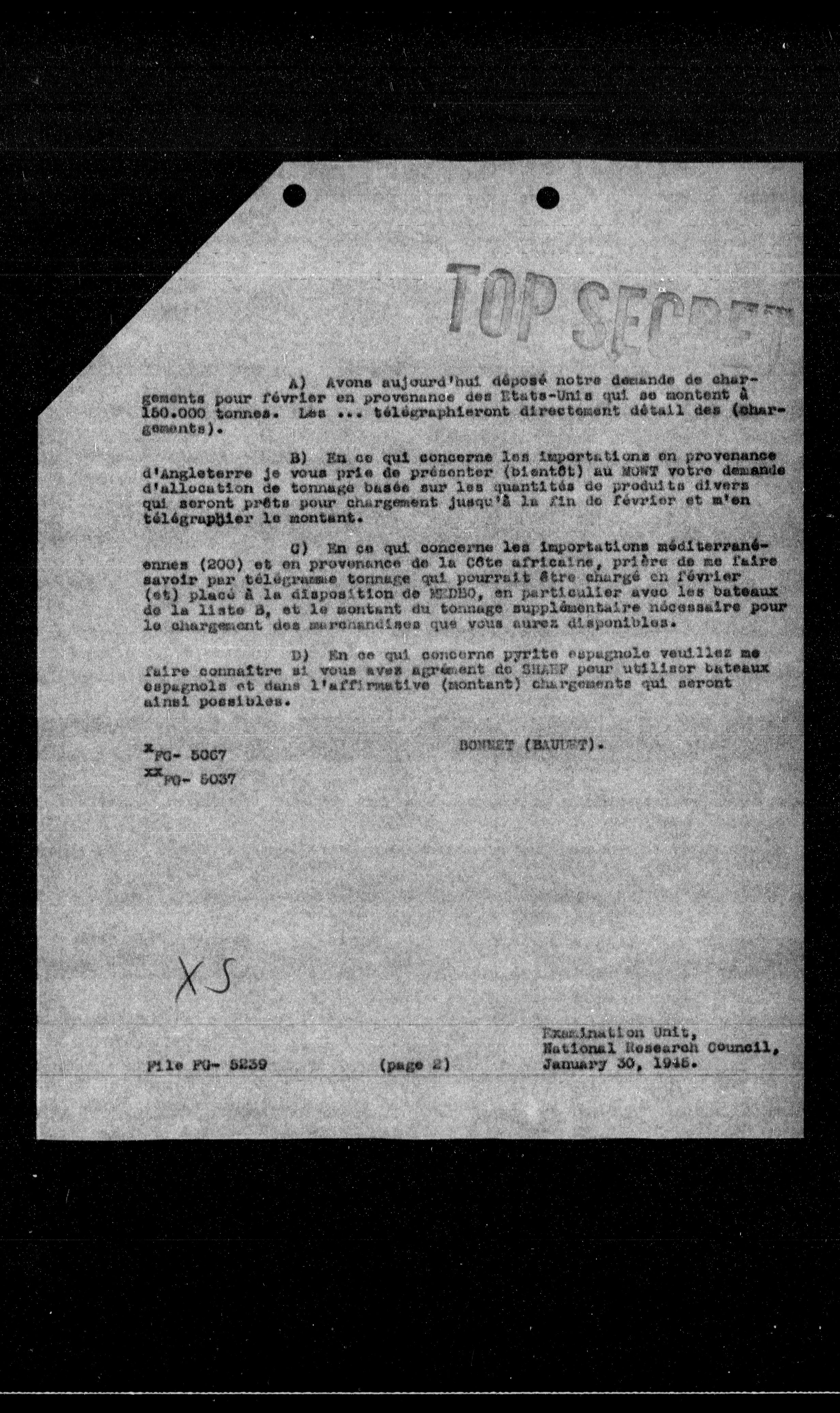 A) Avons aujourd'hui déposé notre demande de chargements pour février en provenance des États-Unis qui se montent à 150.000 tonnes. Les ... télégraphieront directement détail des (chargements).